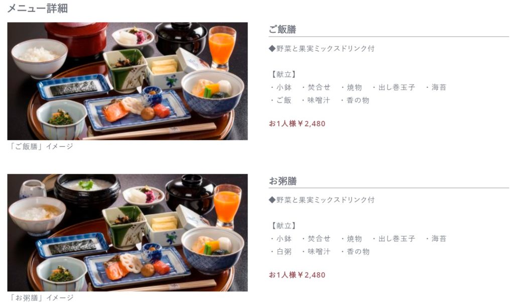 ご飯膳かお粥膳を選択できます。また連泊の場合はメニューをちょっと変更して下さるようです。