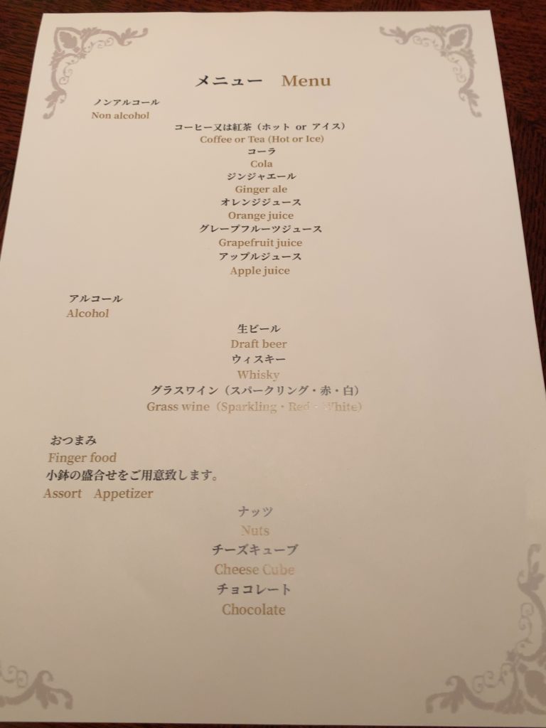 メニューはこんな感じです。アルコールは生ビール、ウイスキー、グラスワイン(赤・白・スパークリング)となります。