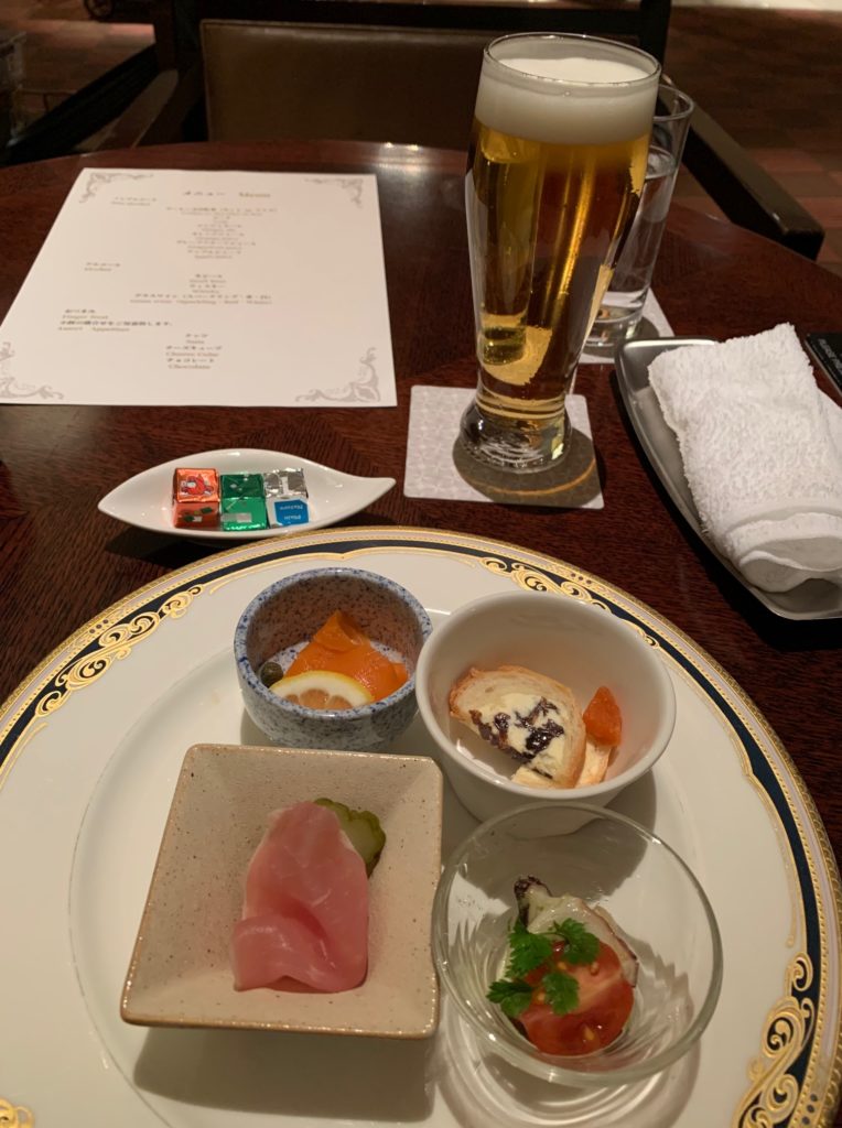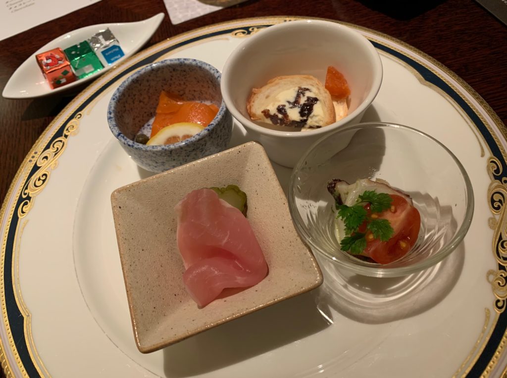 この日はパテドカンパーニュ、生ハム、スモークサーモン、カナダホッキ貝のサラダの4種類の小鉢でした。