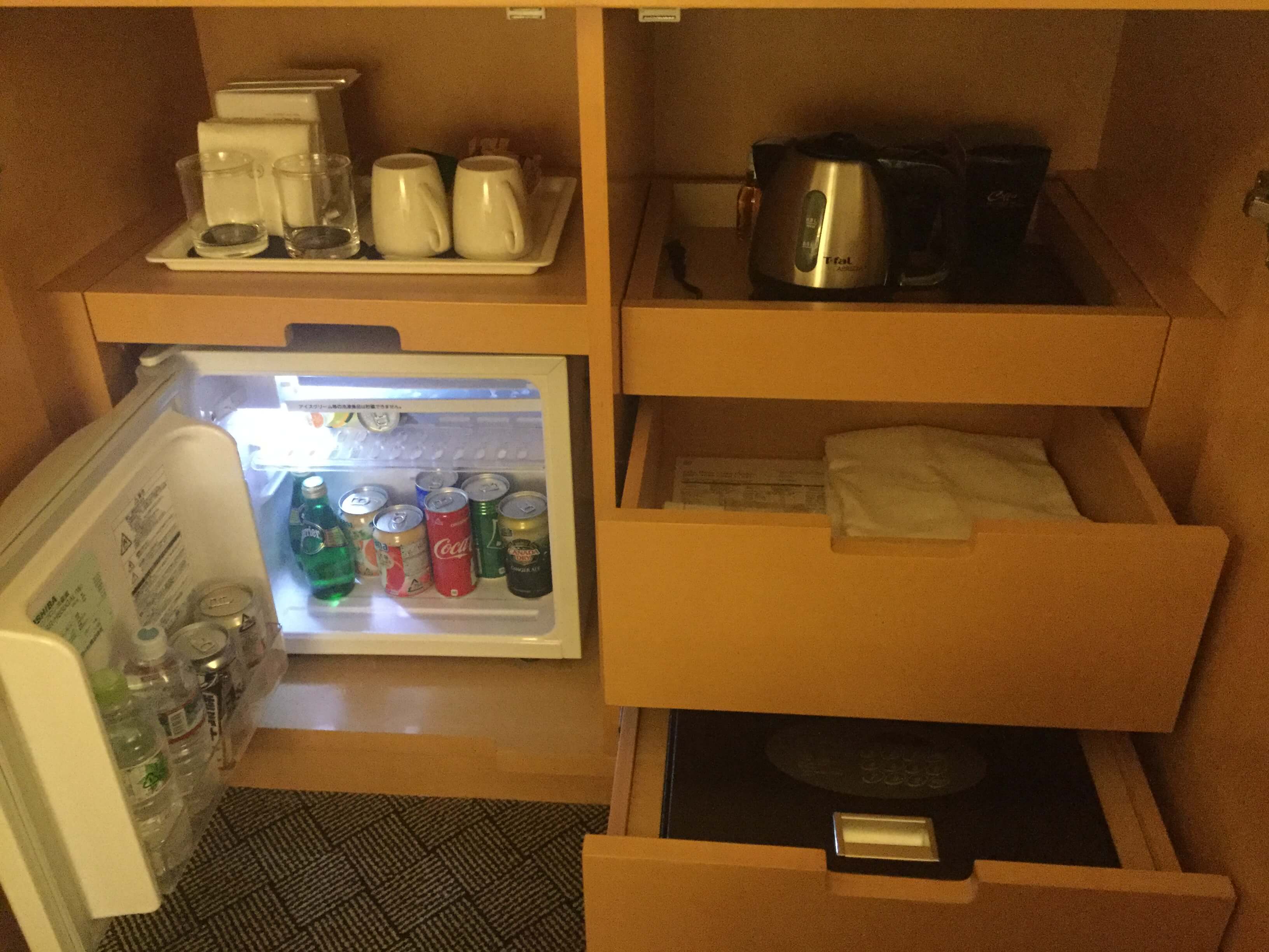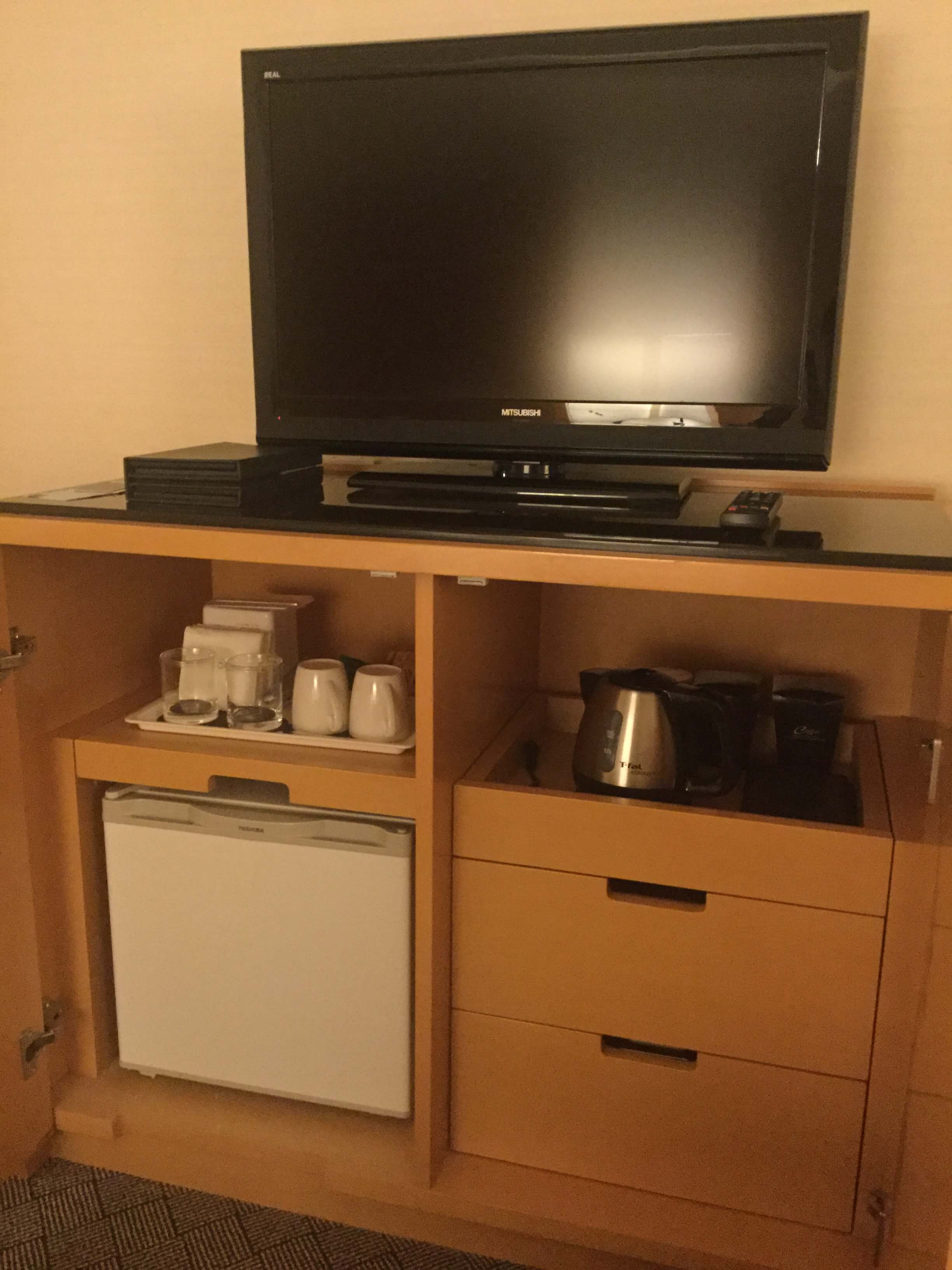 テレビの下には冷蔵庫があり、引き出しの中にはナイトウェアやセーフティボックスが入っています。