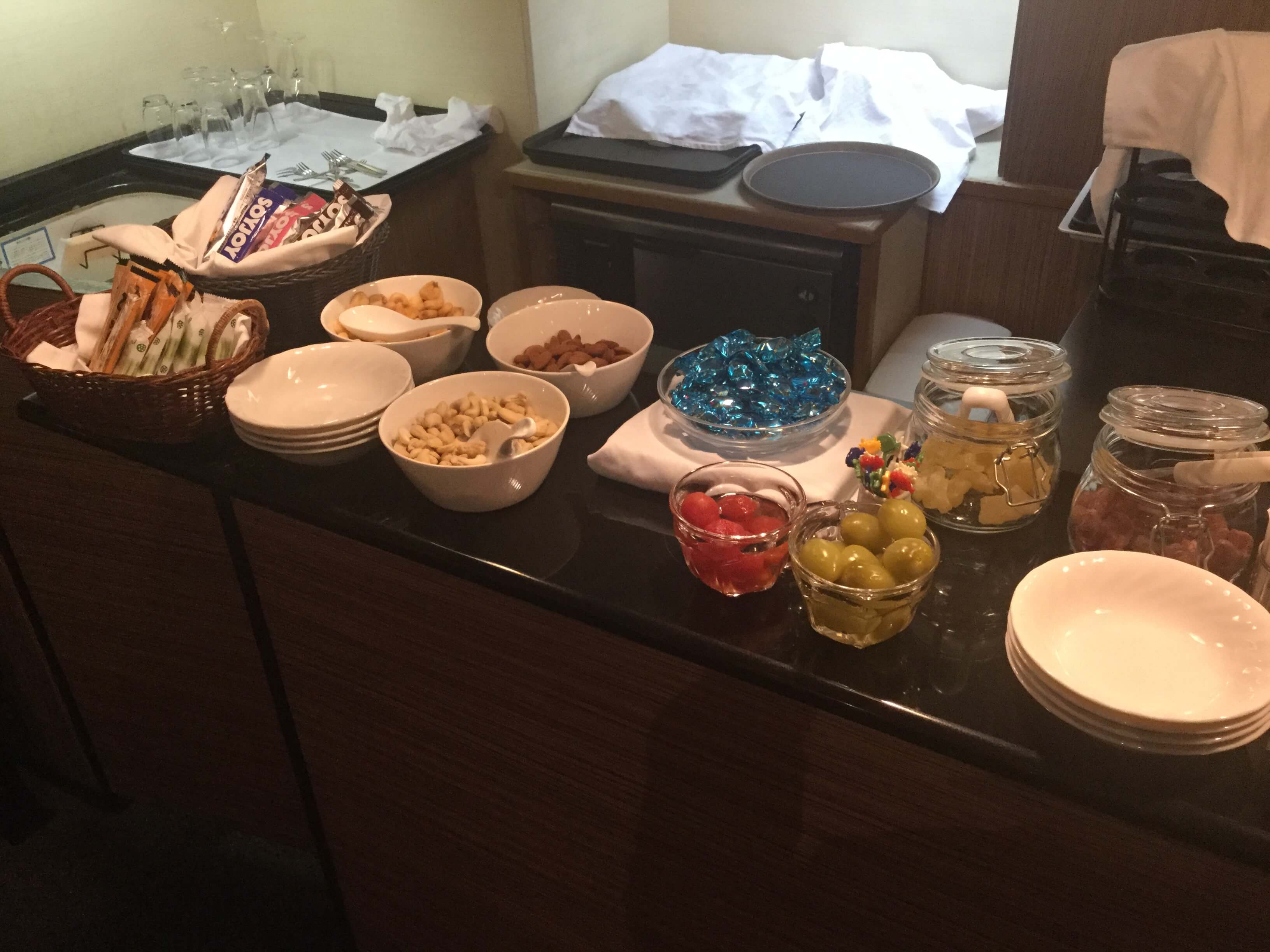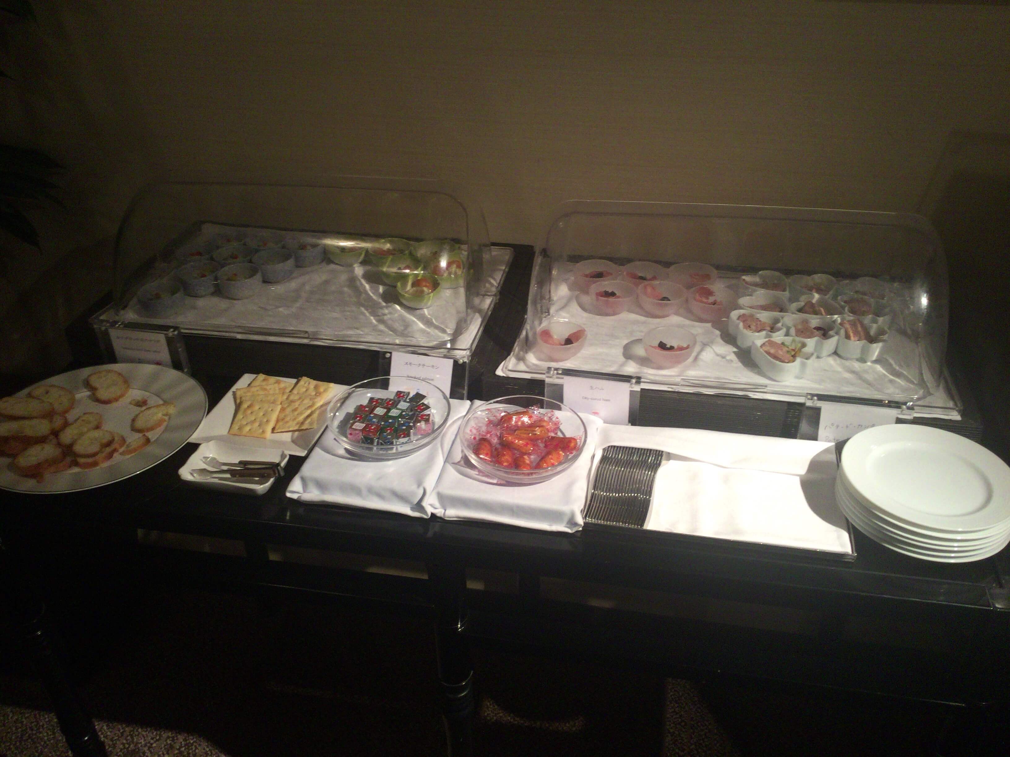 おつまみはナッツ、チーズキューブ、チョコレート程度ですが、18階ラウンジにある小鉢もセットで出していただけます。