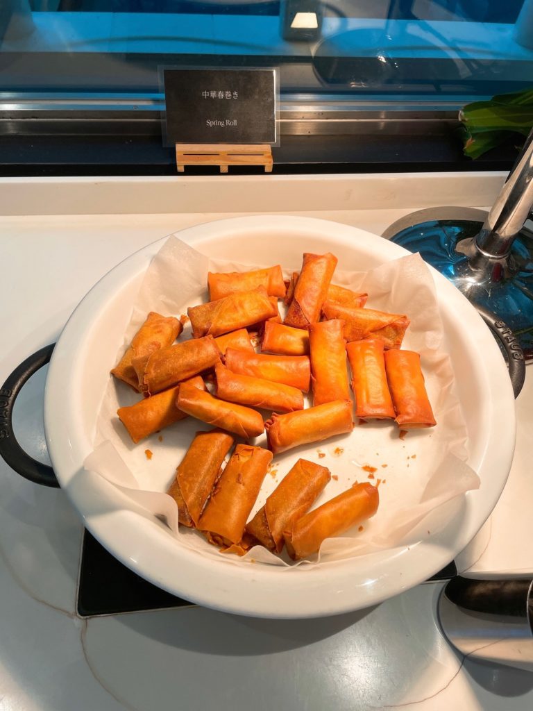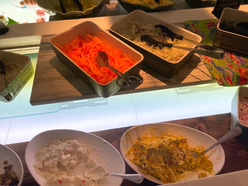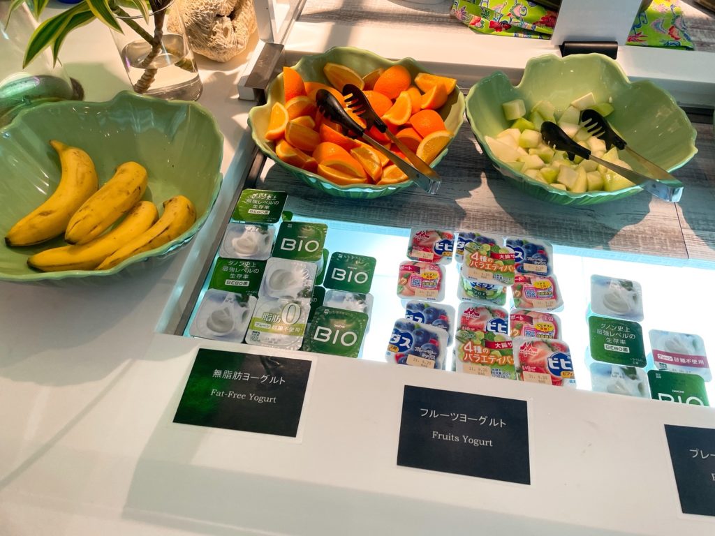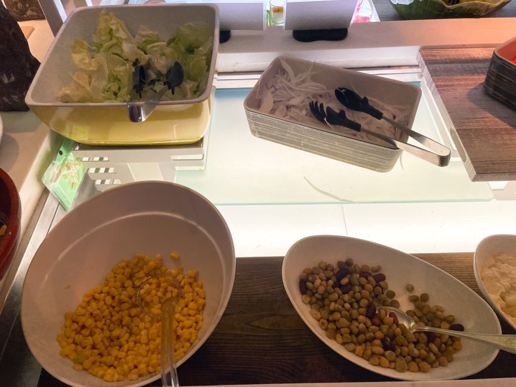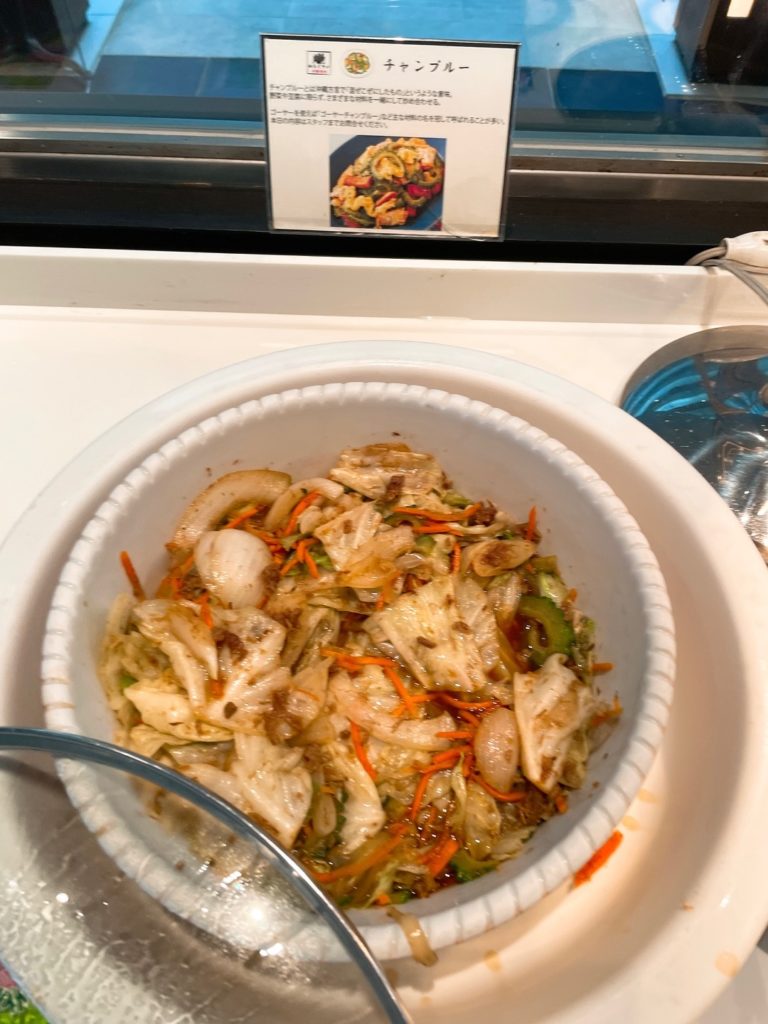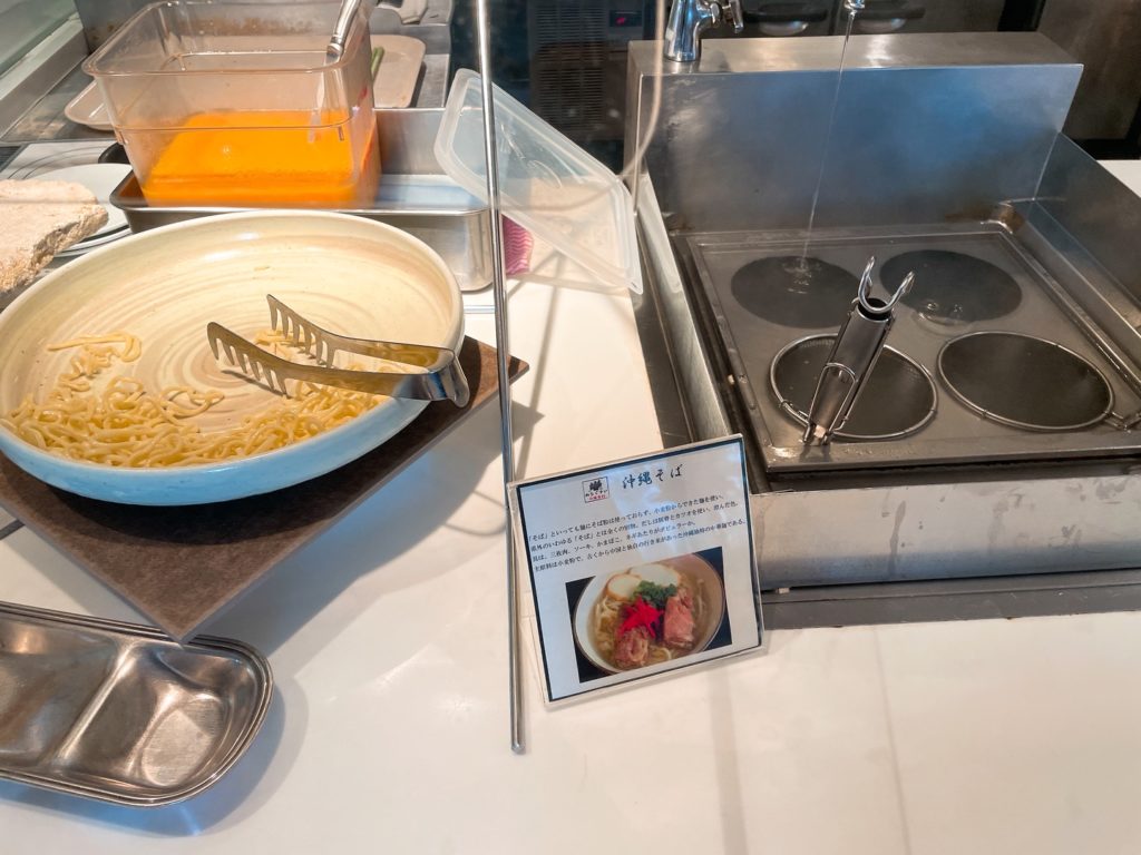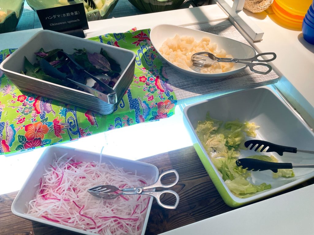 入り口入って左側のカウンターには沖縄料理など温かい料理が並んでいます。ここのフードは日によって少しずつ違っていたので連泊でも飽きませんでした!