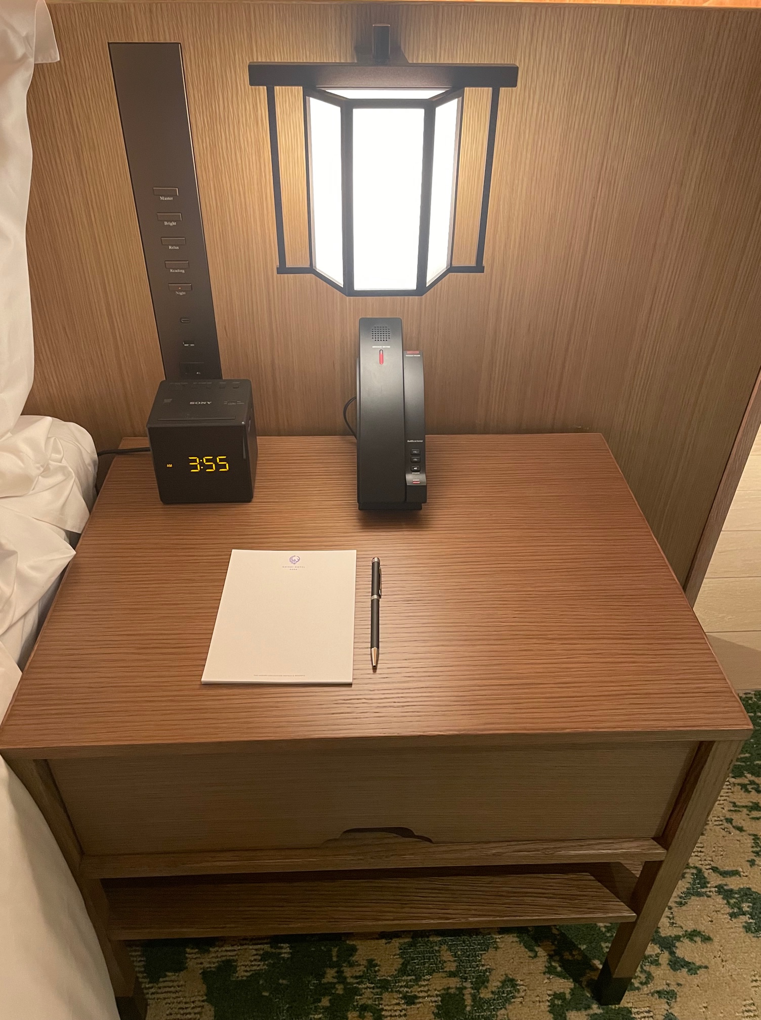 ベッド右側のサイドテーブル上には目覚まし時計と電話、メモ、ペン