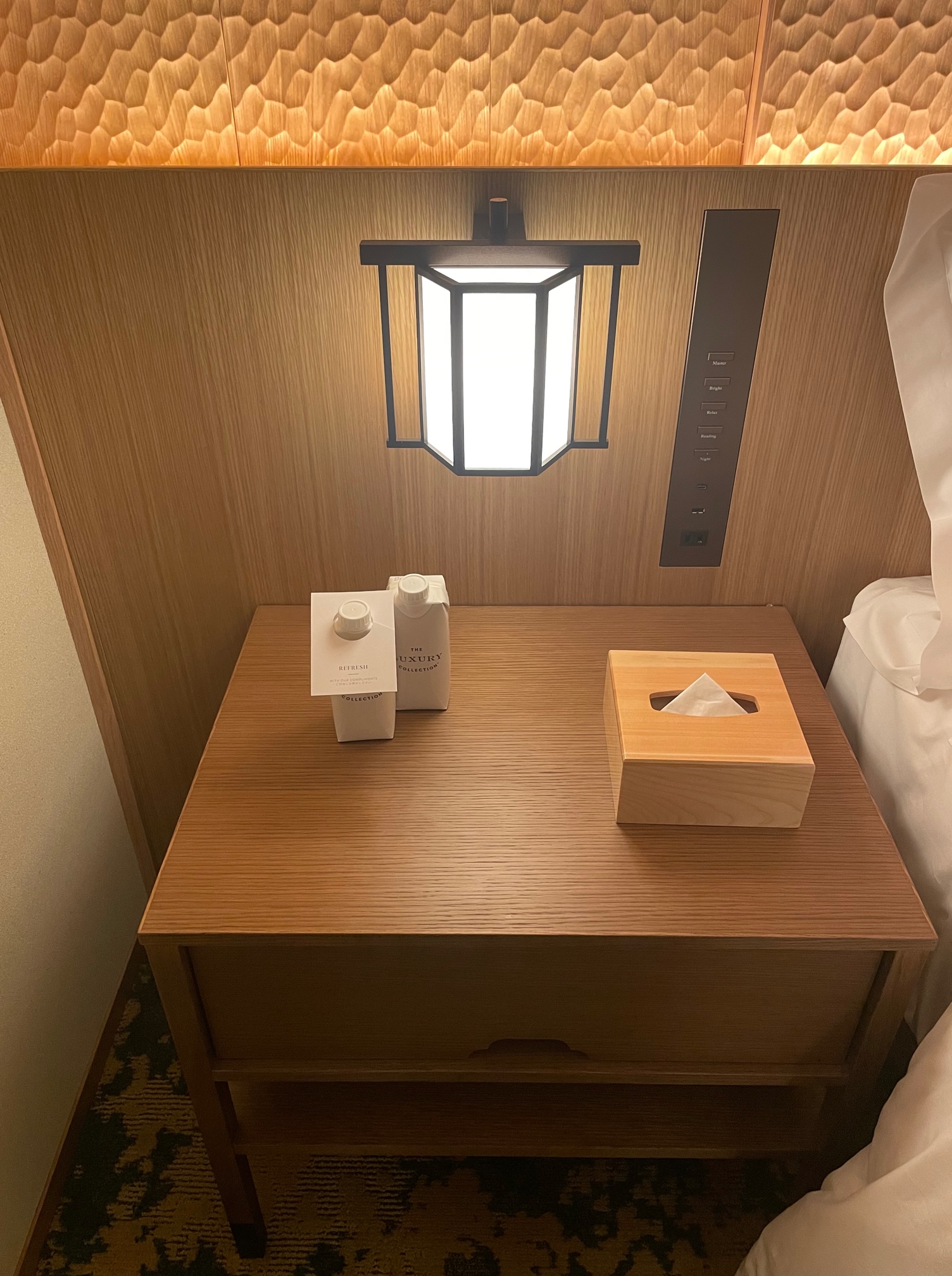 ベッド左側のサイドテーブルにはティッシュと水が置かれています。照明のスイッチとコンセント類は同じ。