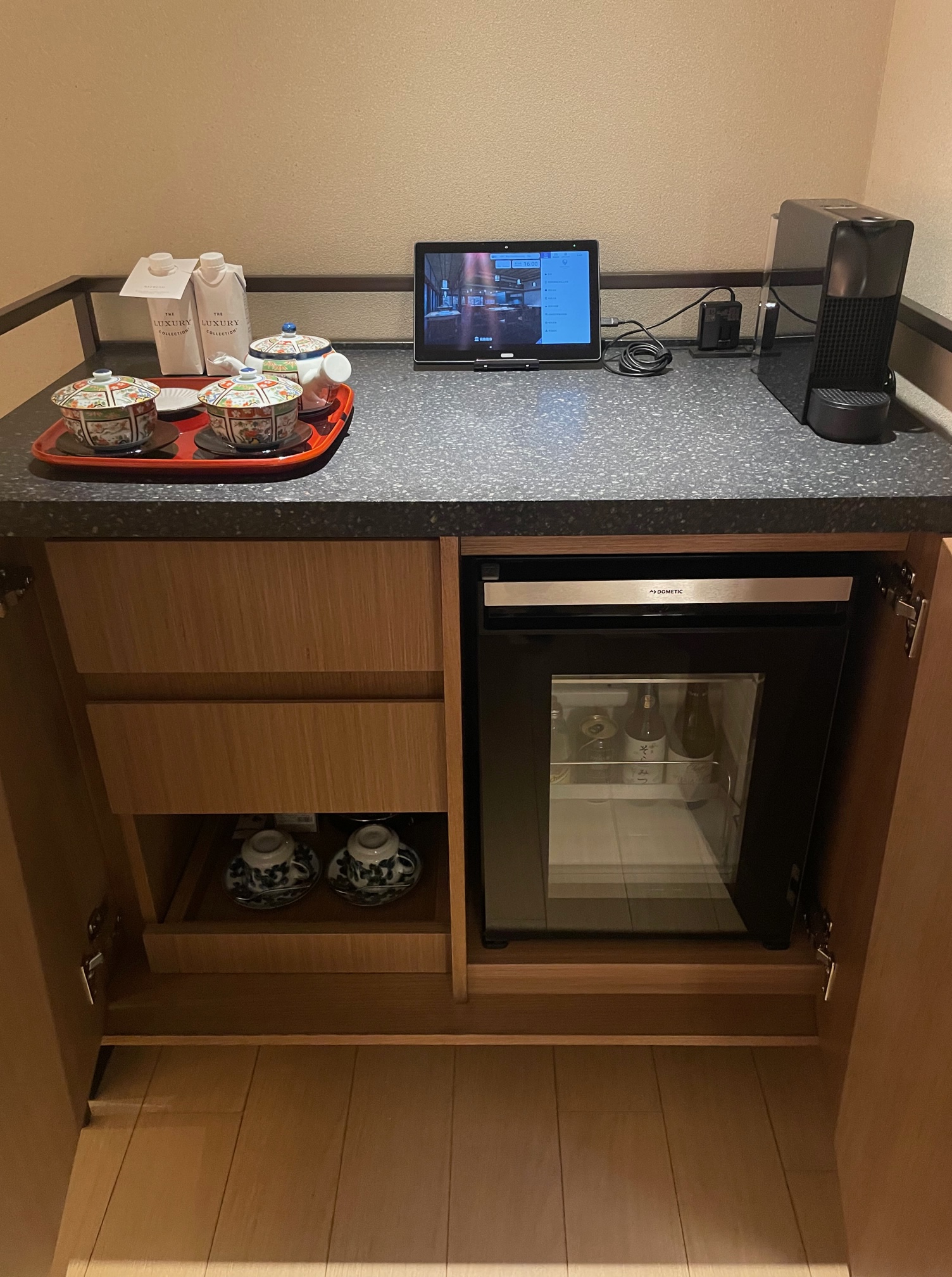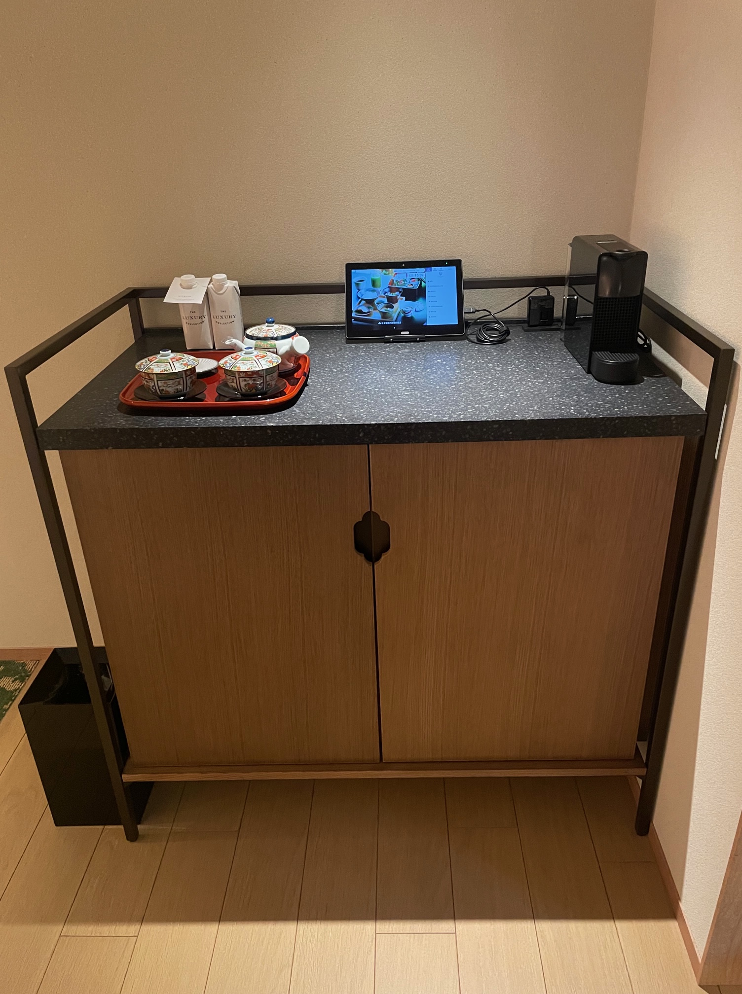 左手下段の引き出し内には電気ケトル、カップ&ソーサ、