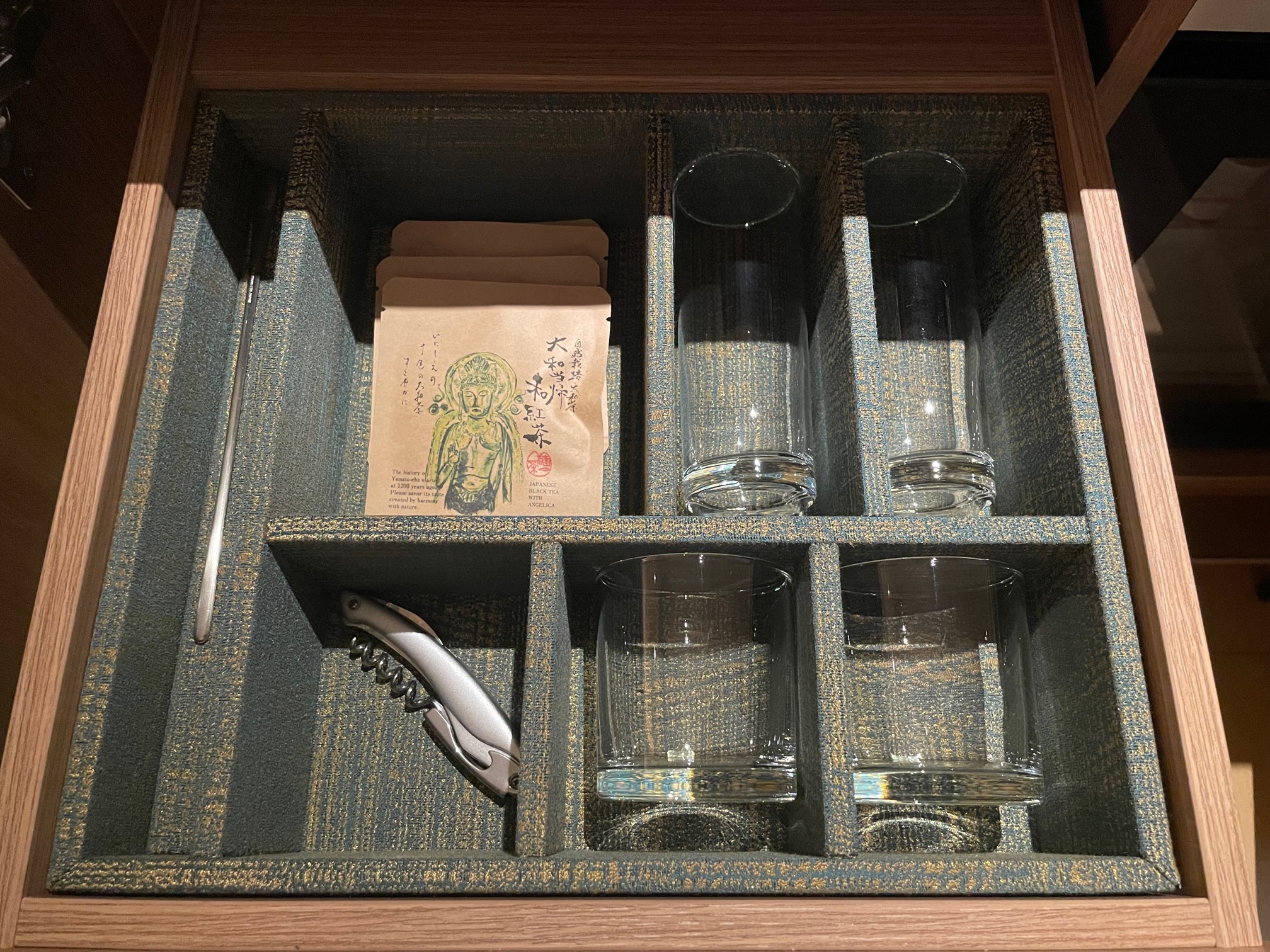 左手上段の引き出し内にはグラスやソムリエナイフ、マドラー、サービスの大和紅茶