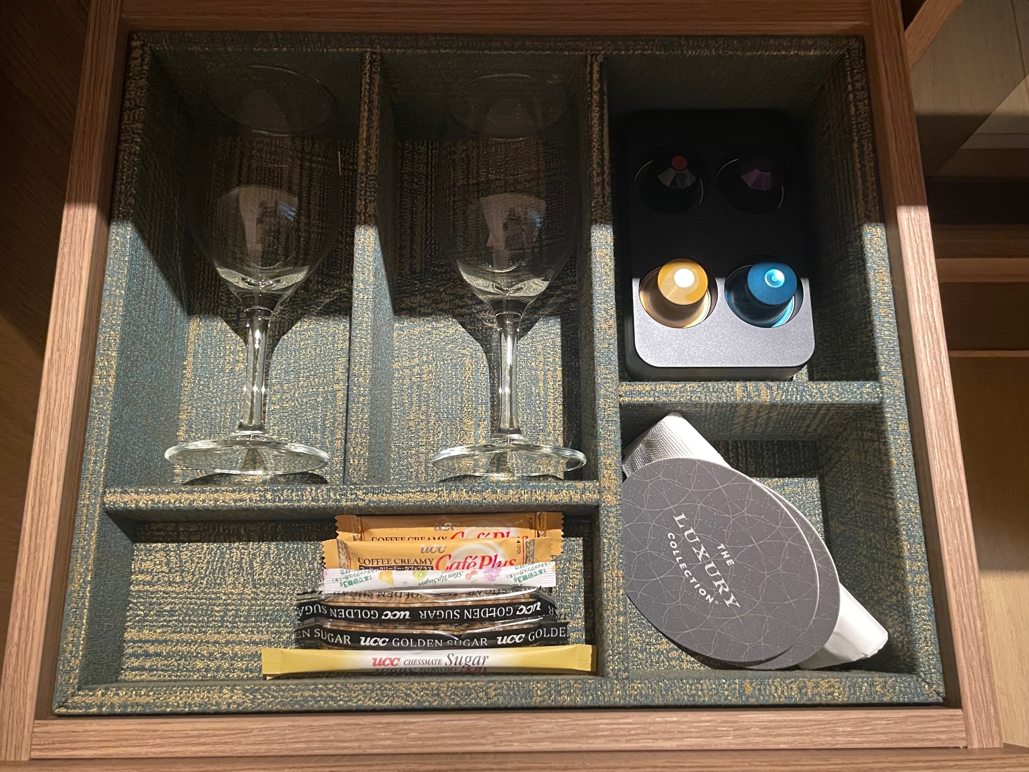 左手中段の引き出し内にはワイングラス、ネスプレッソ、コーヒー、コースターなど