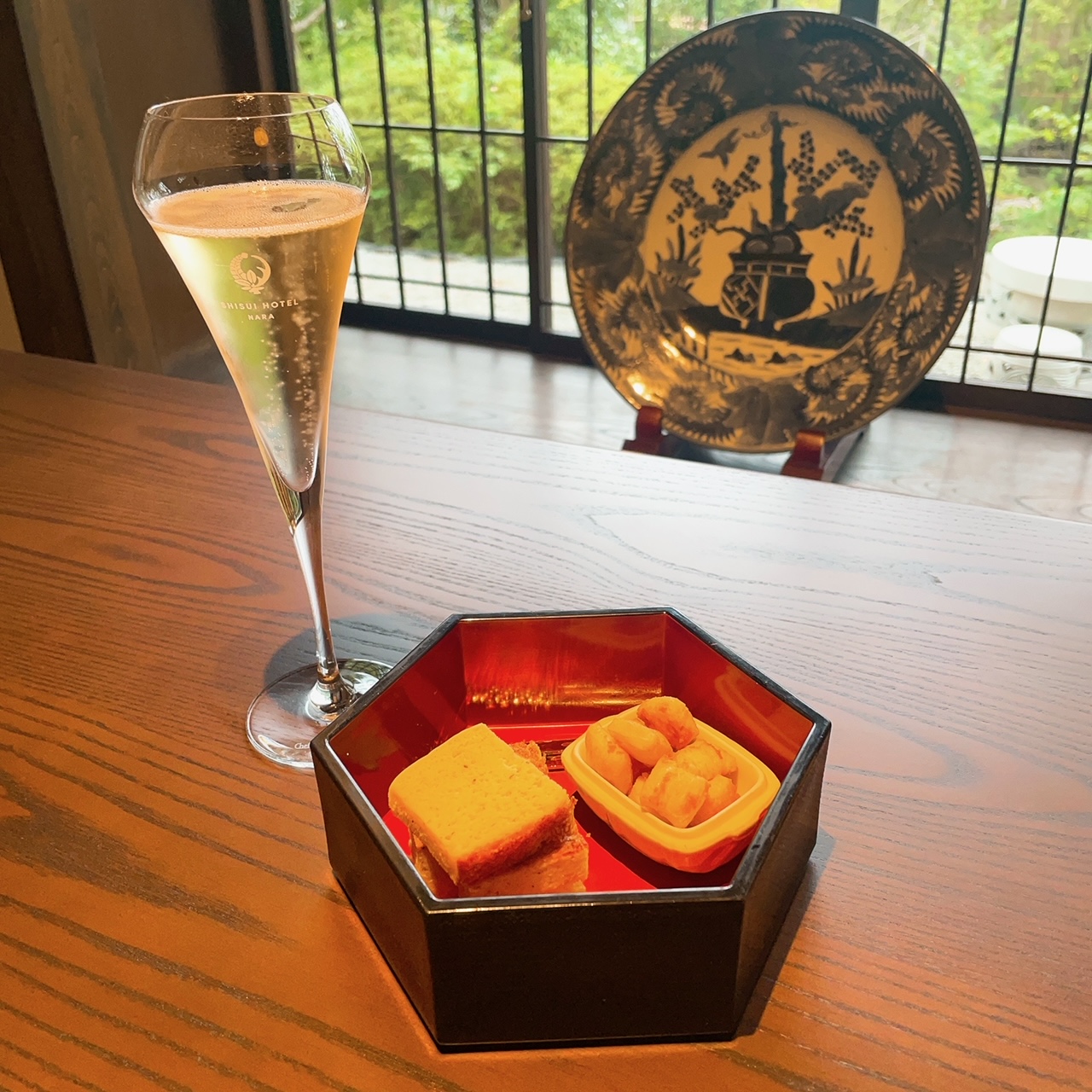 トリュフのケークサレと奈良漬おかきが提供されます。翠嵐ではフードもおかわりできましたが、紫翠では特に声掛けなく下げられたのでおかわりはできないんですかね