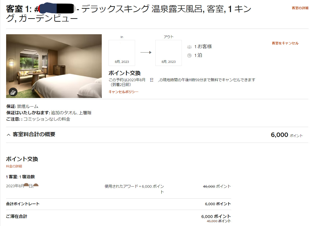 今回は46000ポイントで無料宿泊を予約していましたので、上限40000ポイントの無料宿泊に6000ポイント追加して宿泊しました!そして、ボトムの部屋からデラックスキング(露天温泉風呂付)にアップグレードして頂きました!