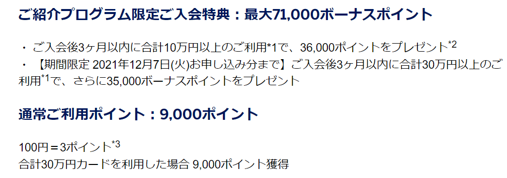 | 入会後3か月以内に10万円利用でボーナスポイント | 36,000ポイント |