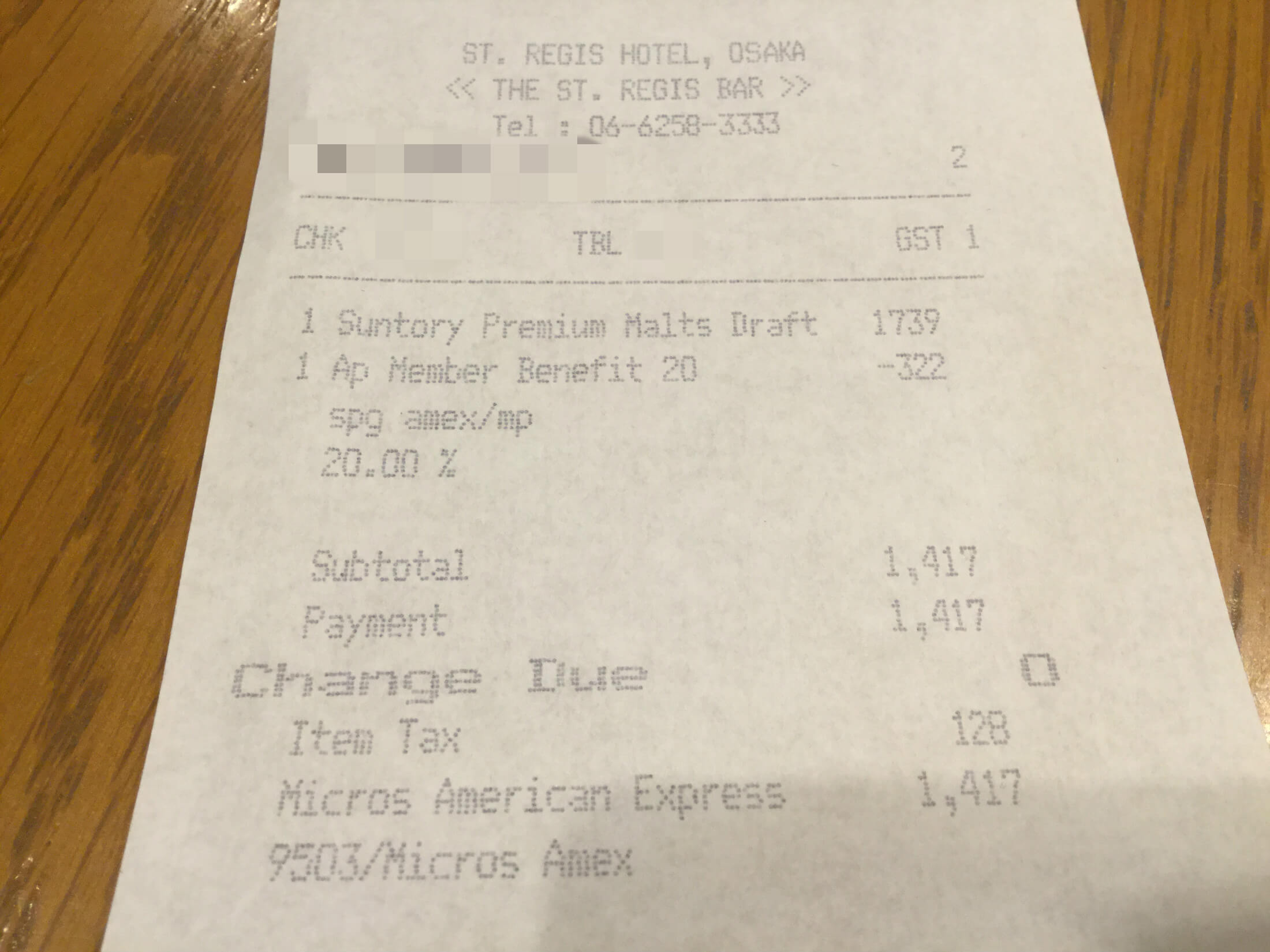 プレミアムモルツ生とSPGアメックスキャンペーンオリジナルカクテルの合計2杯を頂いて、MEMBERS DINE MOREでプラチナの20%オフを適応して頂き、合計は1417円でした!
