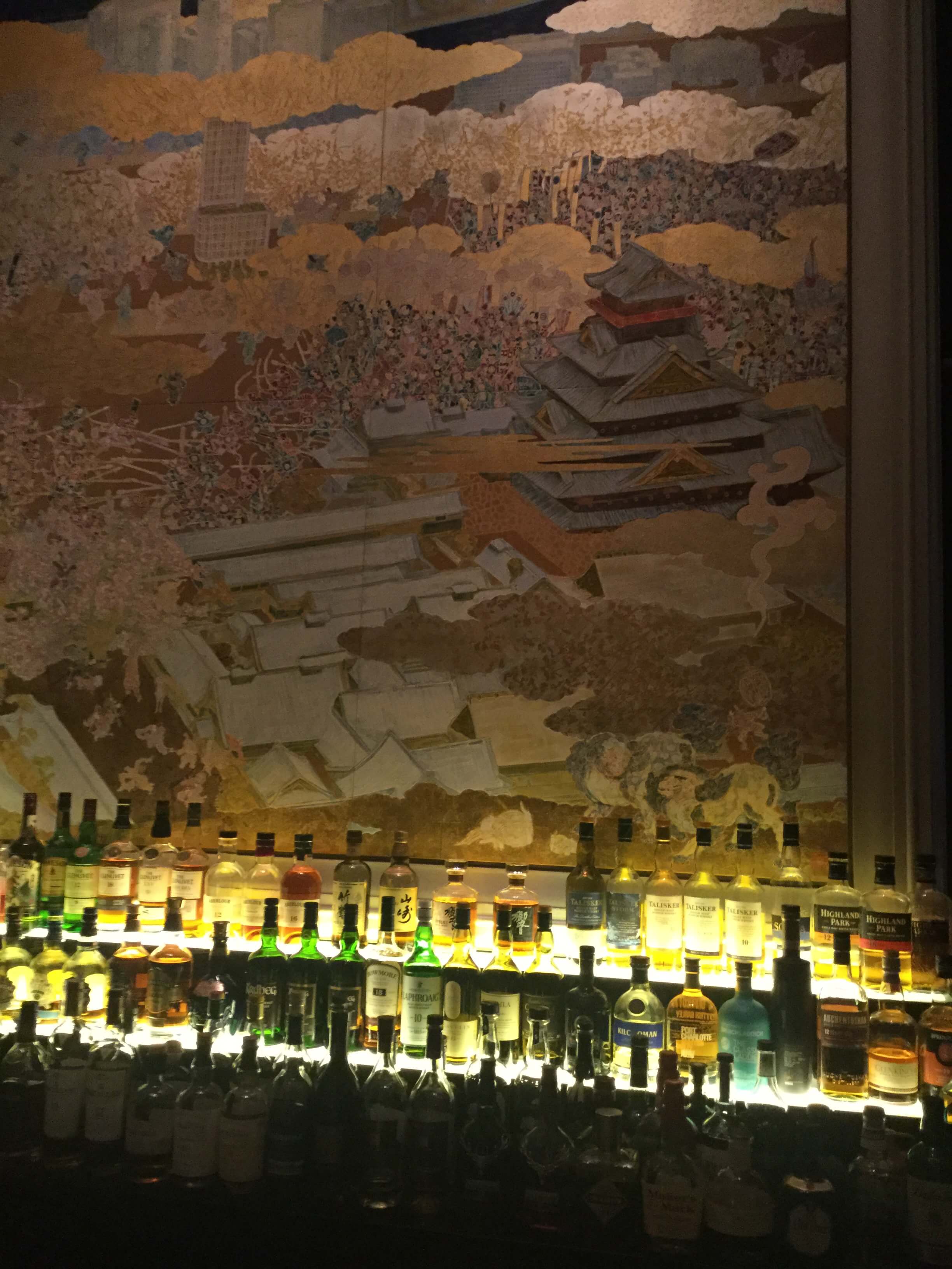 セントレジスバーの座席の種類はソファ席が中心です。店内は高級感ある調度品で落ち着いた大人の空間です。店内の一番奥には存在感がある金色のパネルがあり、その前にはバーカウンターがあり6席のスツールが並んでいます。1人でしたので奥のカウンターに案内されます。金色のパネルには、大阪城や通天閣、太陽の塔など大阪のシンボルが描かれています。