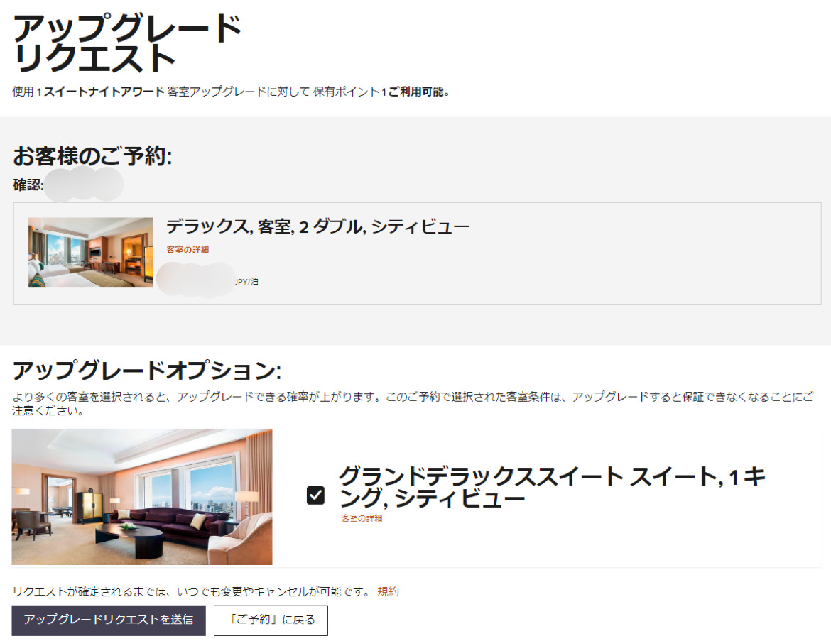 今回は一番下のランクであるデラックスで予約をしてスイートナイトアワード(SNA)を申請していました。スイートナイトアワード(SNA)については以下の記事をご参照ください