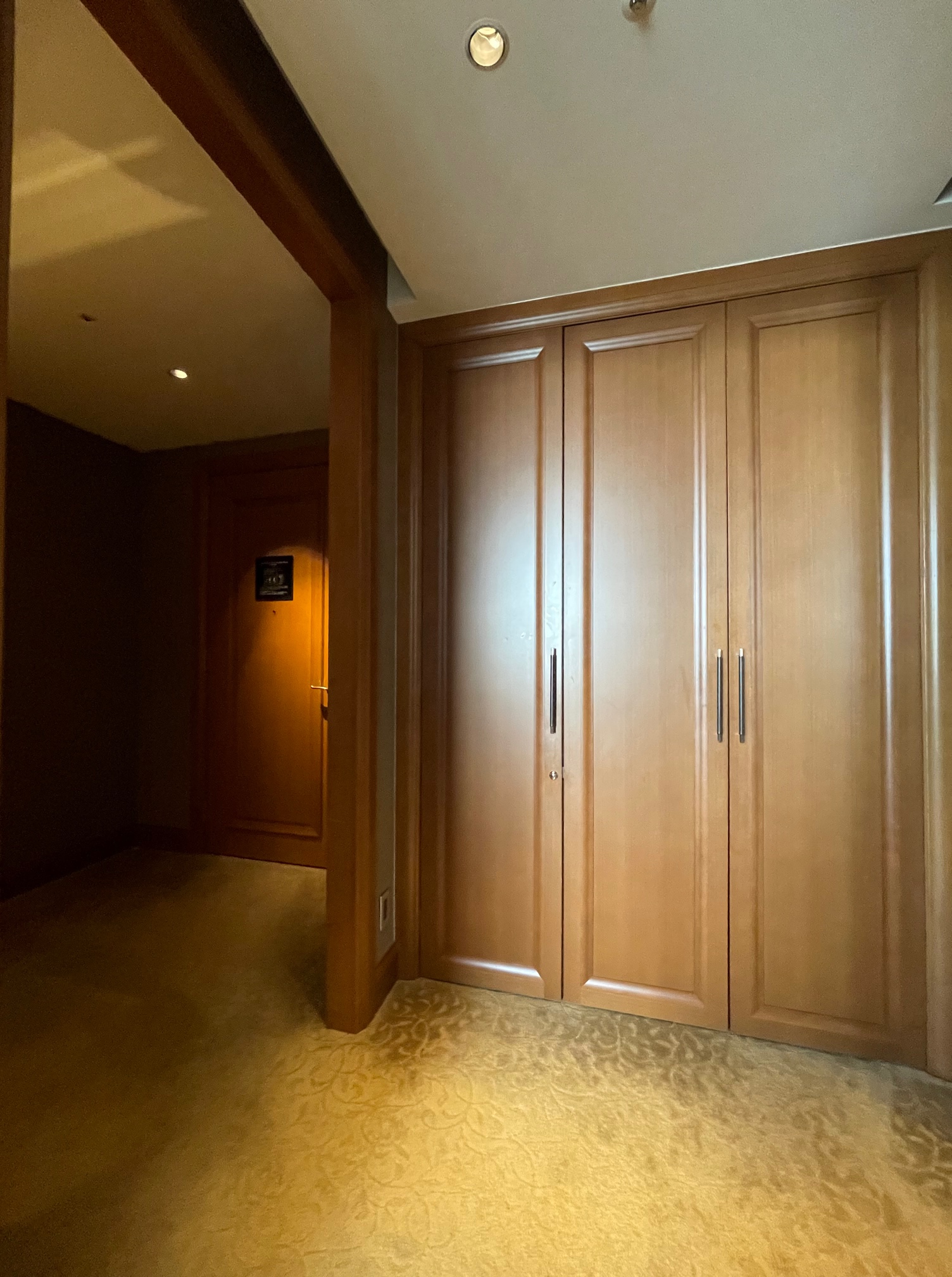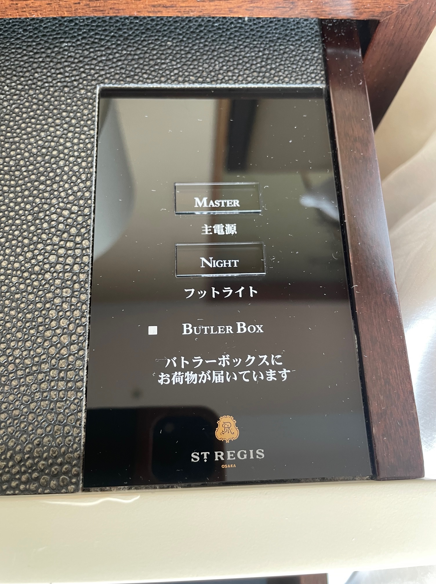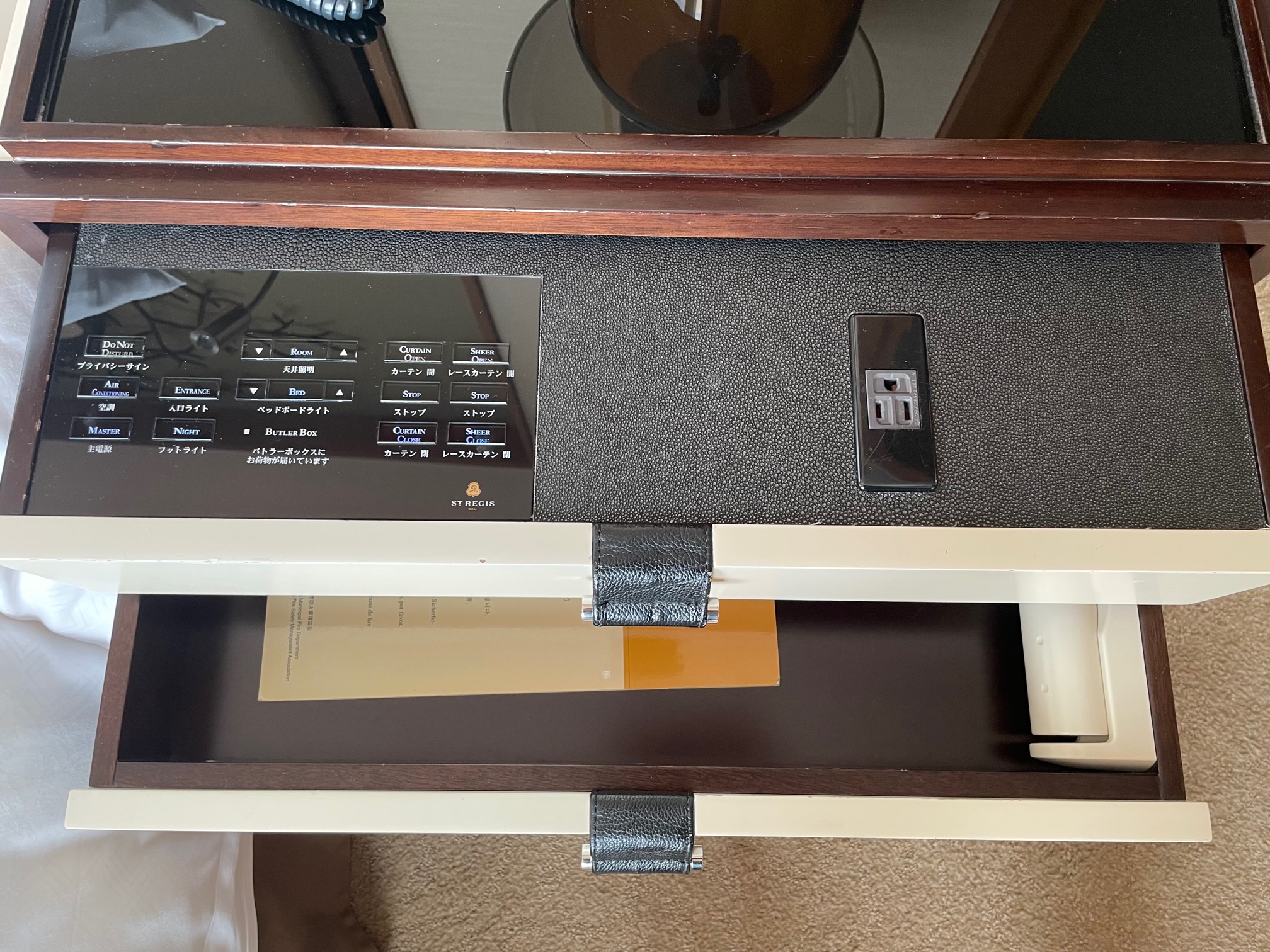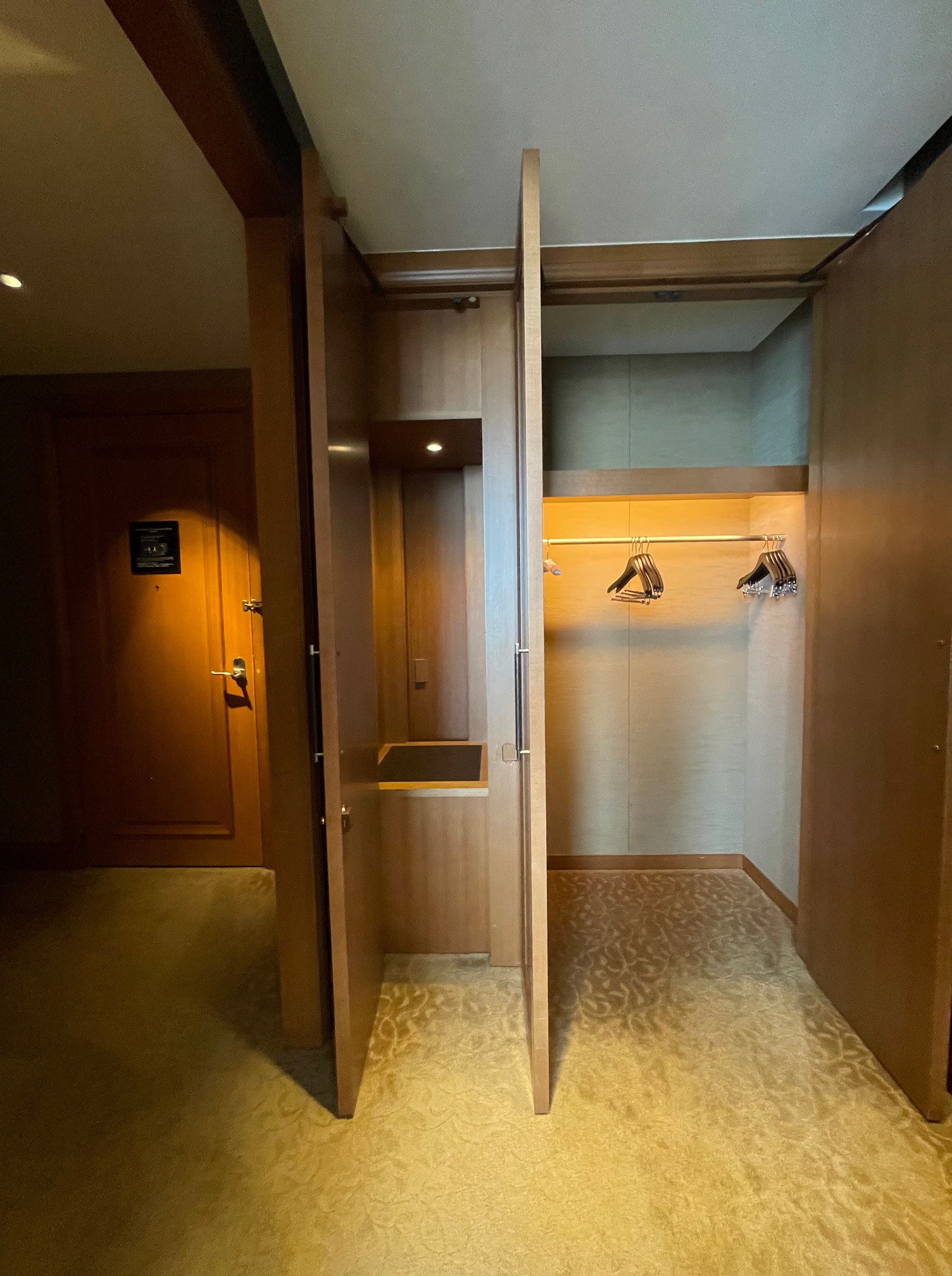 客室に入ってすぐ、ドアの横(写真左側の扉)にはセントレジスに特徴的な「バトラーボックス」があります。ランドリーやシューシャインをお願いしたいときにはこちらのボックスに入れておくと持って行ってくれます。また、新聞やランドリー、シューシャイン後の靴などはこのボックス内に届けられます。プライバシーを損なうことなく、いちいち部屋の外に出なくても受け取ることができて便利です。