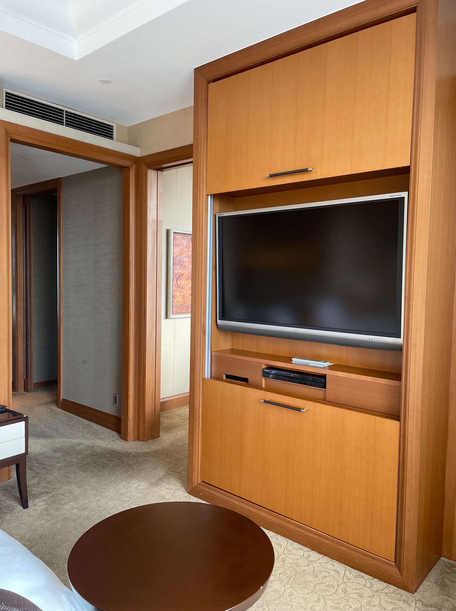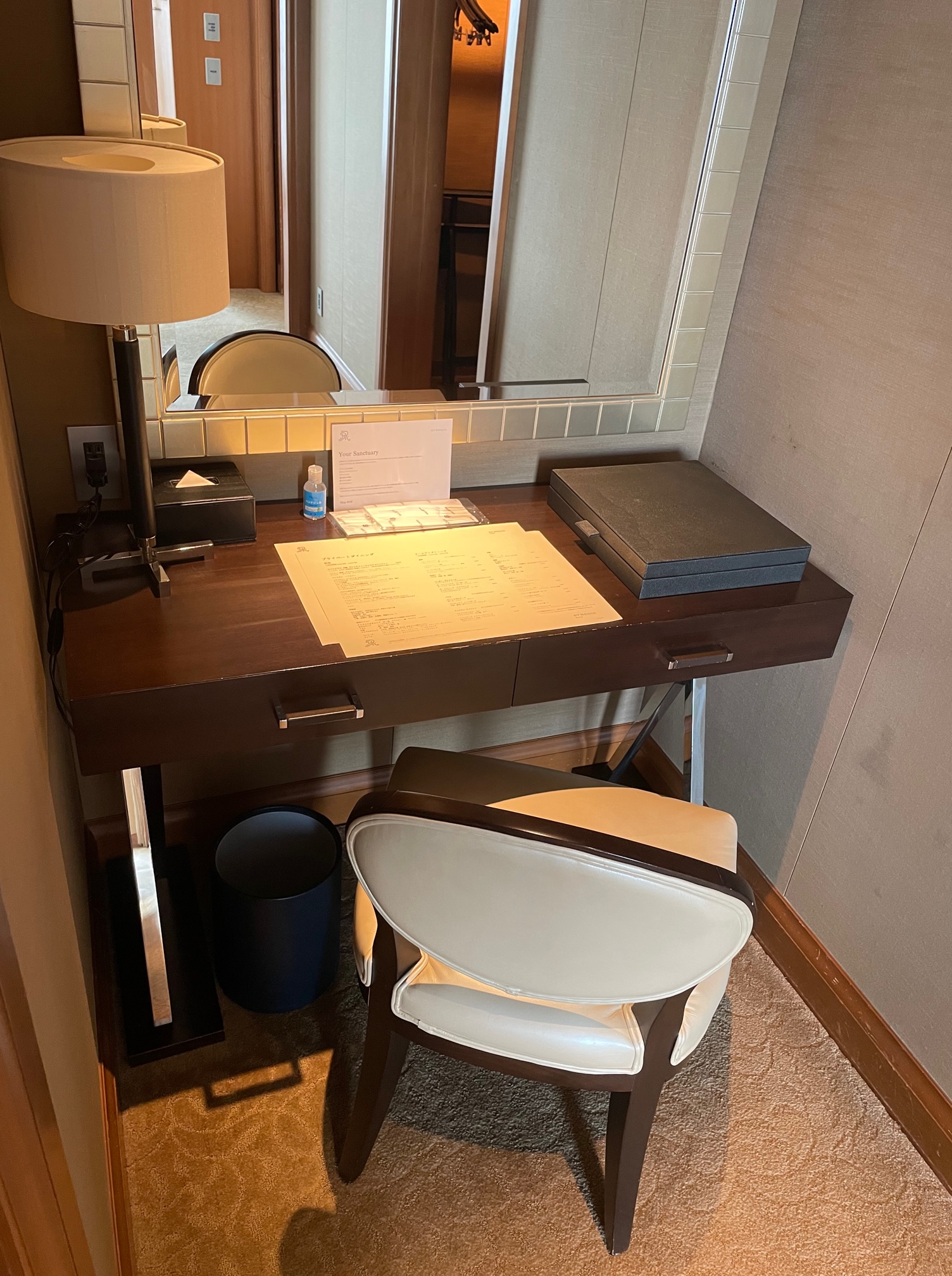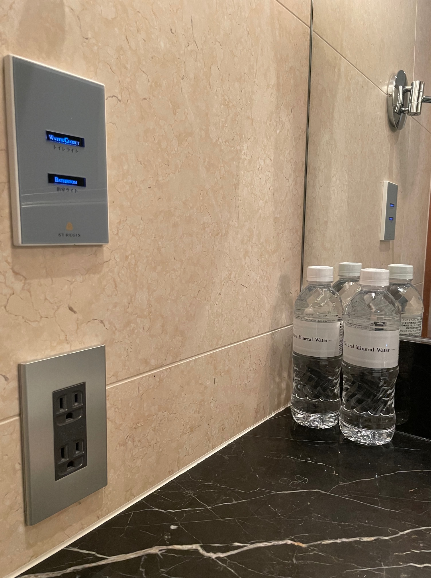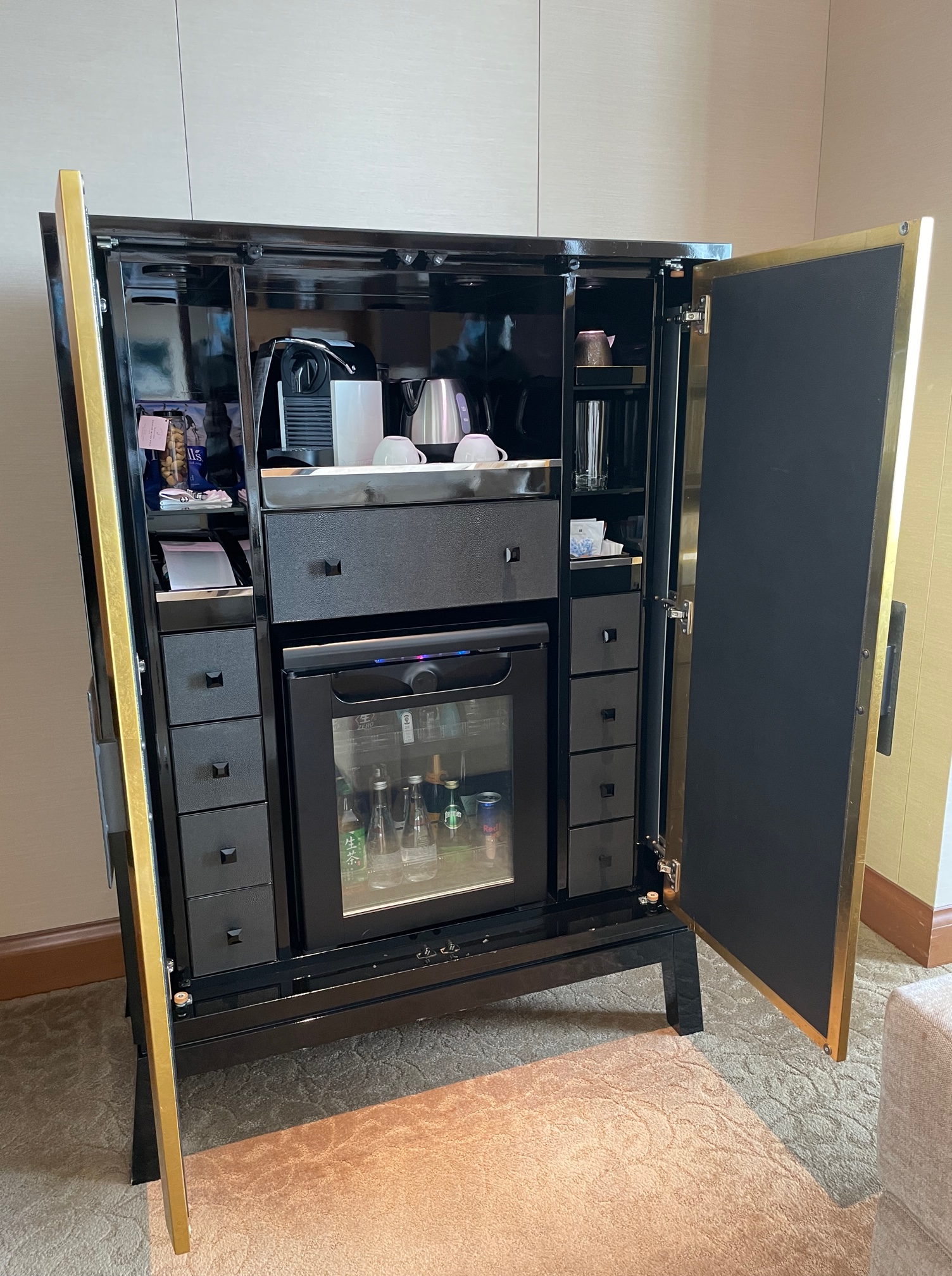 客室に入ってすぐ、ドアの横(写真左側の扉)にはセントレジスに特徴的な「バトラーボックス」があります。ランドリーやシューシャインをお願いしたいときにはこちらのボックスに入れておくと持って行ってくれます。また、新聞やランドリー、シューシャイン後の靴などはこのボックス内に届けられます。プライバシーを損なうことなく、いちいち部屋の外に出なくても受け取ることができて便利です。