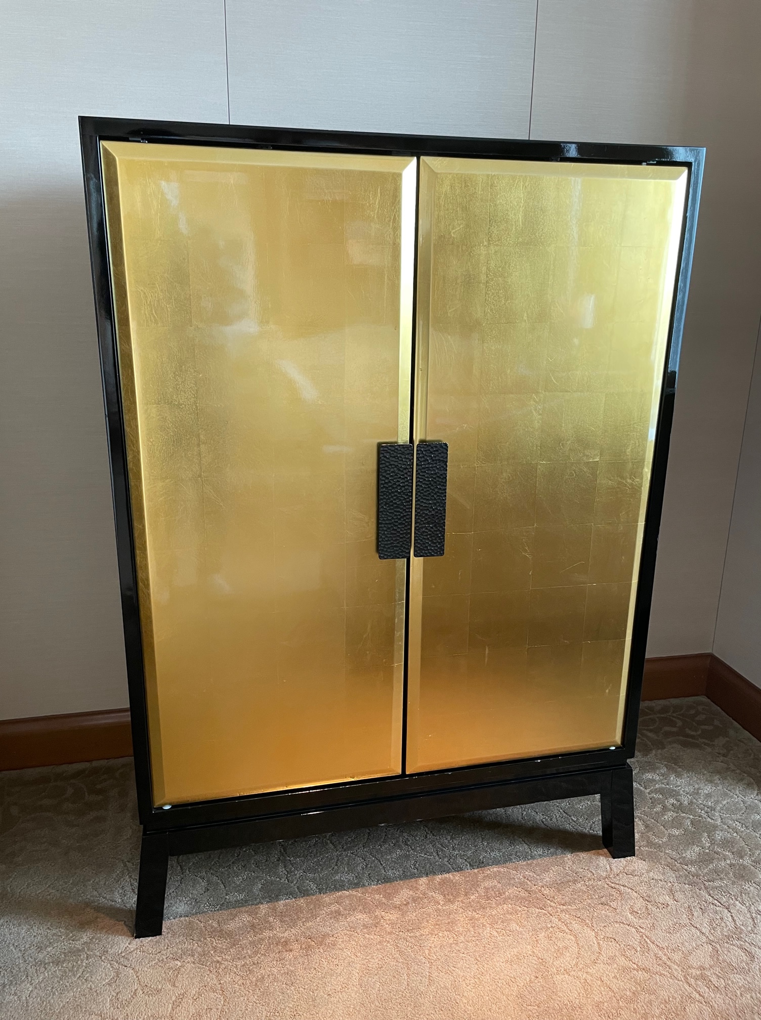 入ってすぐのリビングルームでまず目に飛び込んでくるのは金色のキャビネット!