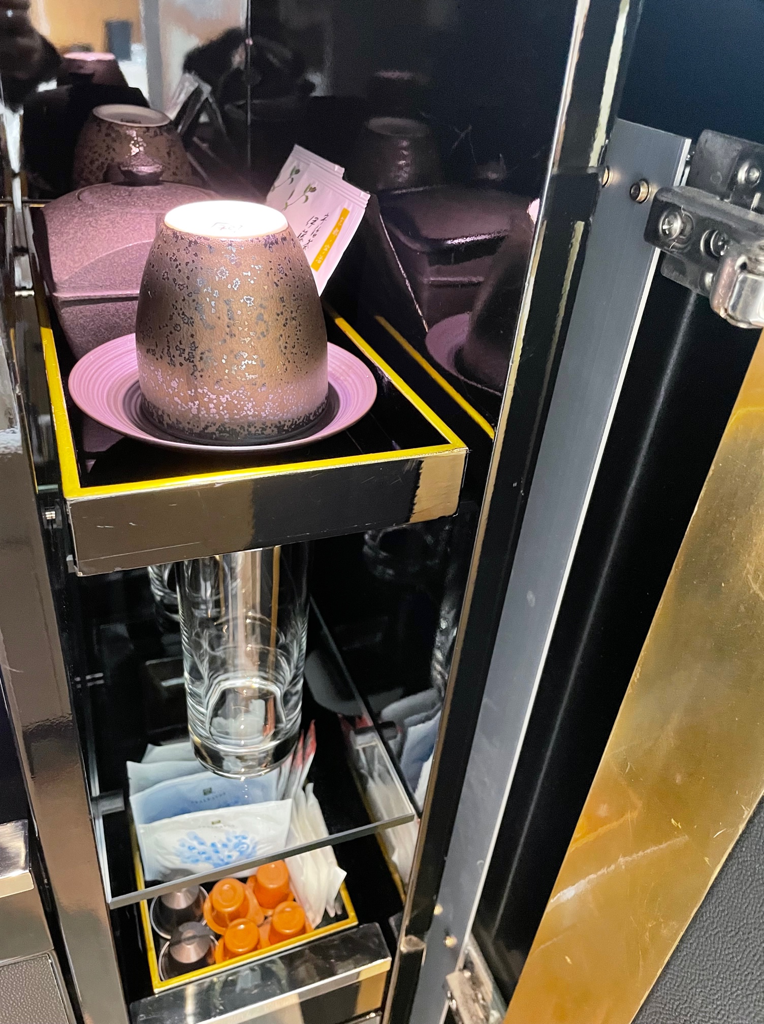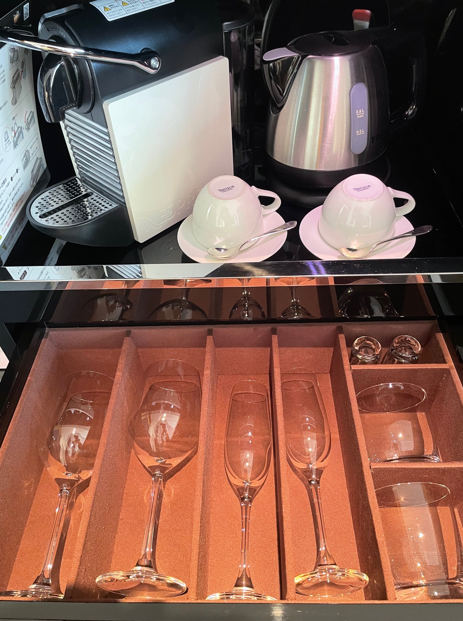 真ん中上段にはエスプレッソマシーンと電気ケトル、カップ&ソーサなどがあります。その下の引き出しの中にはワイングラス、シャンパングラスなど様々なタイプのグラス類が置かれています。