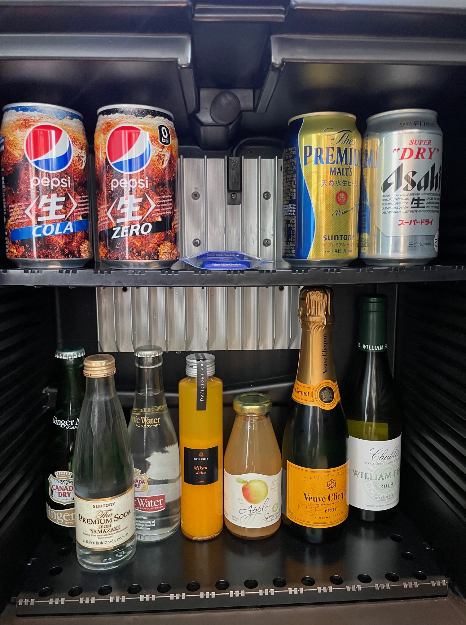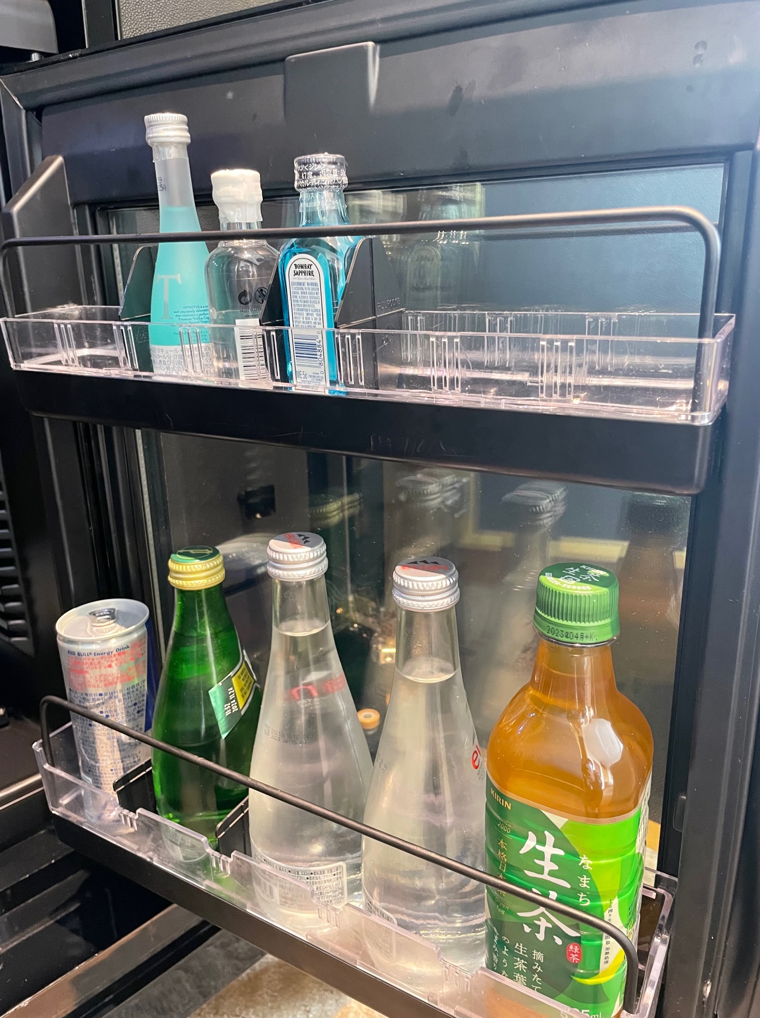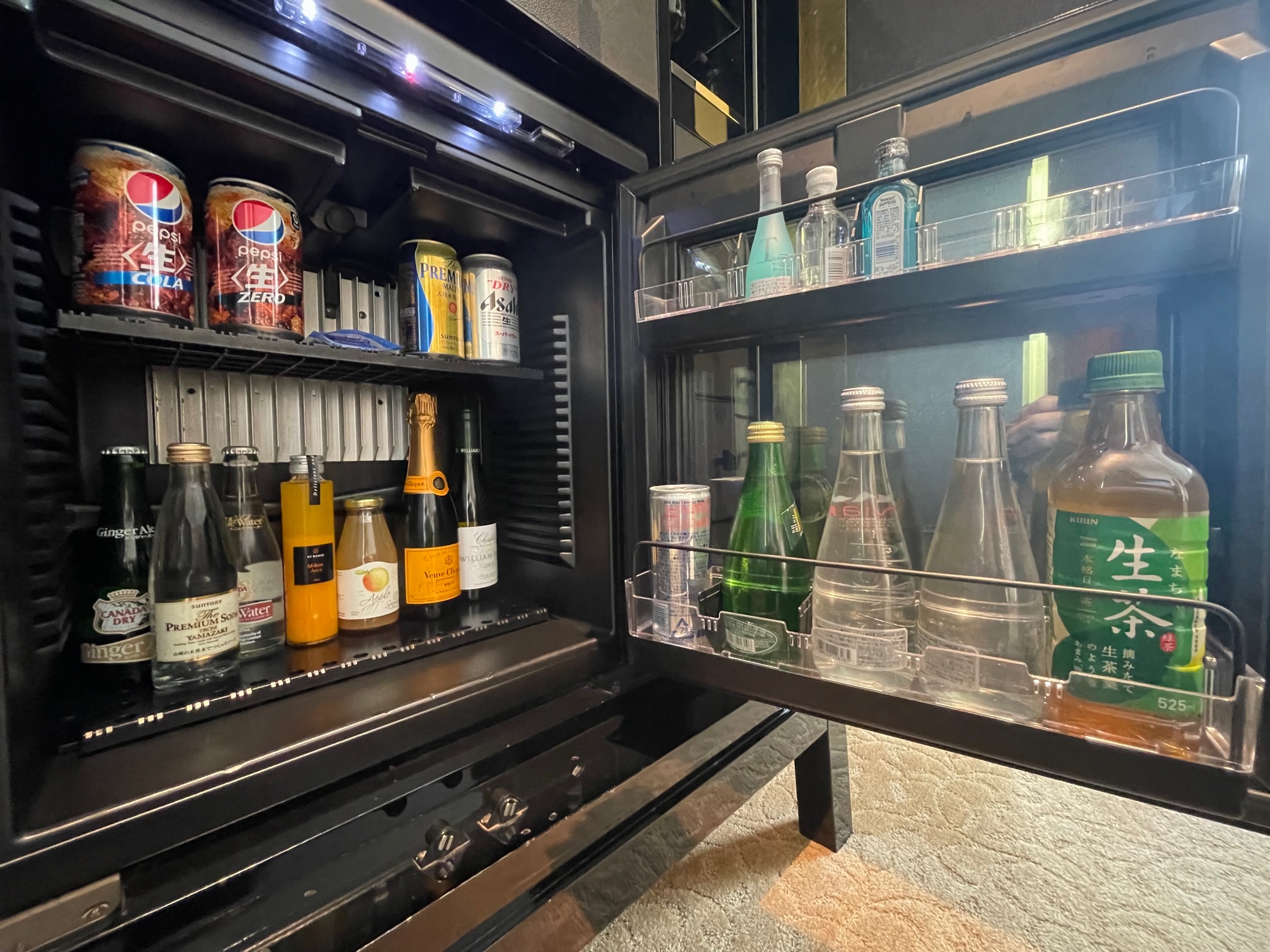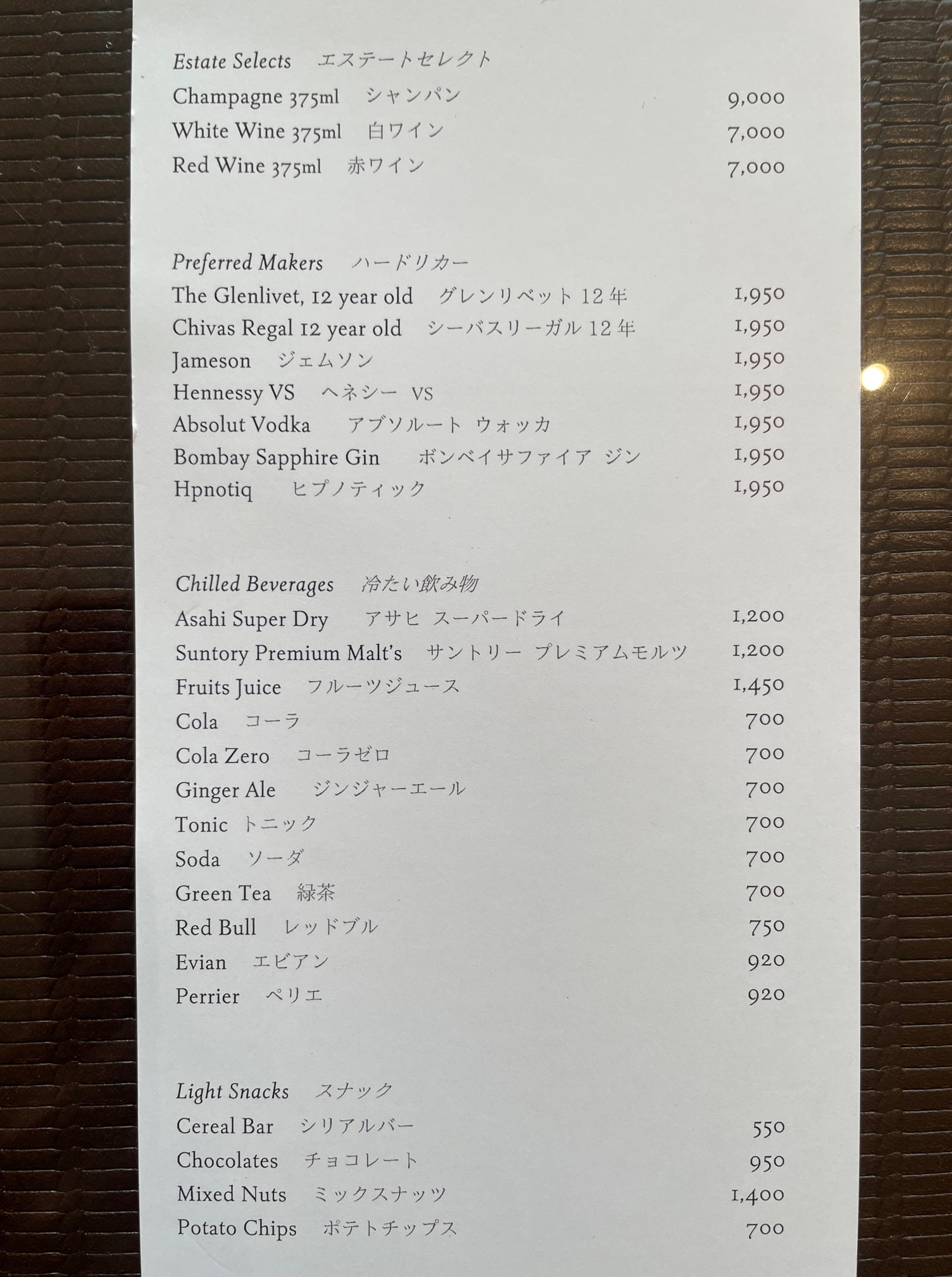 セントレジス大阪にはエグゼクティブラウンジがありませんので、その代わりのサービスと思われます。ミニバーの値段は以下のようになっており、缶ビール1本1200円とかなりお高いです…