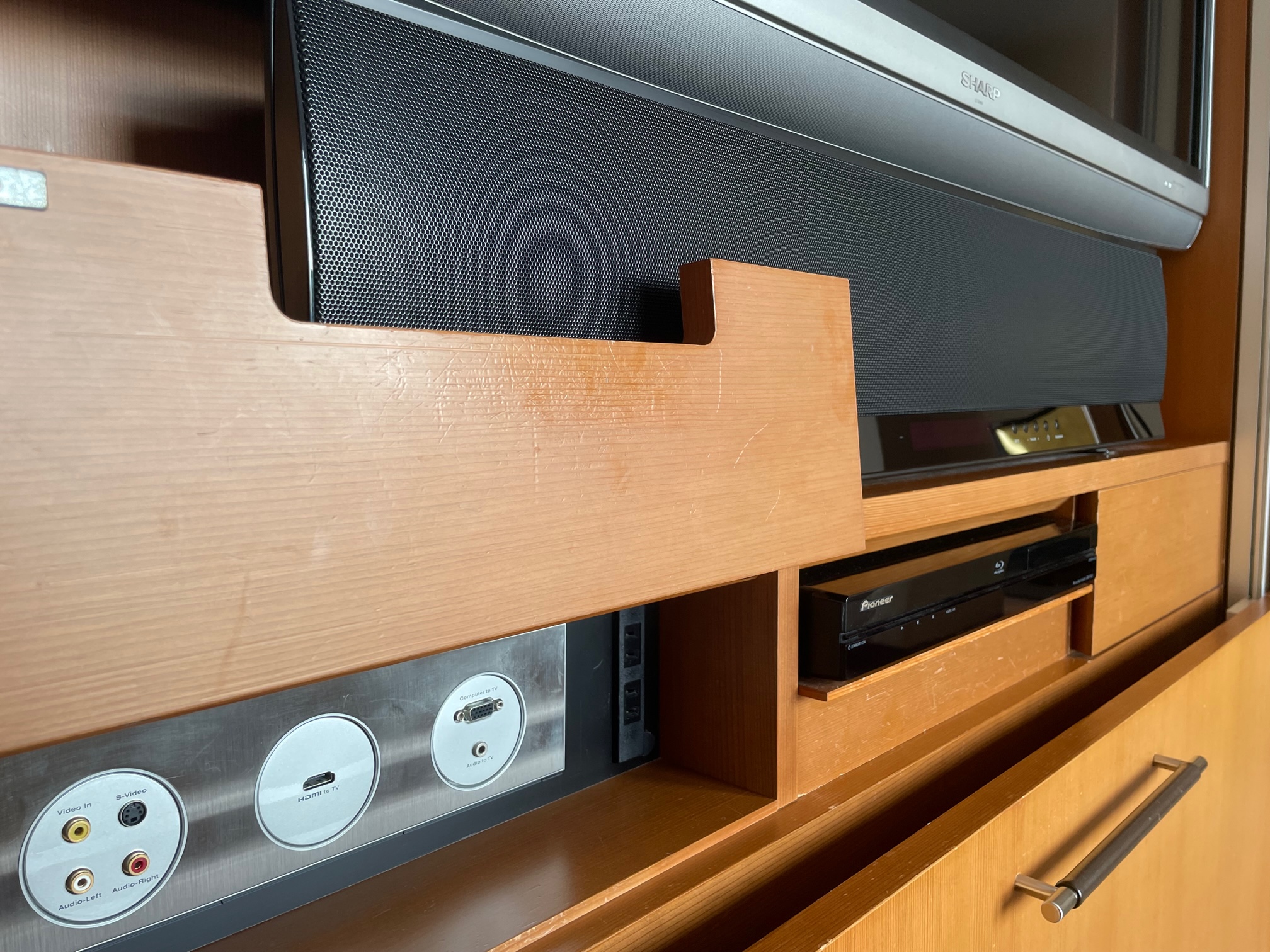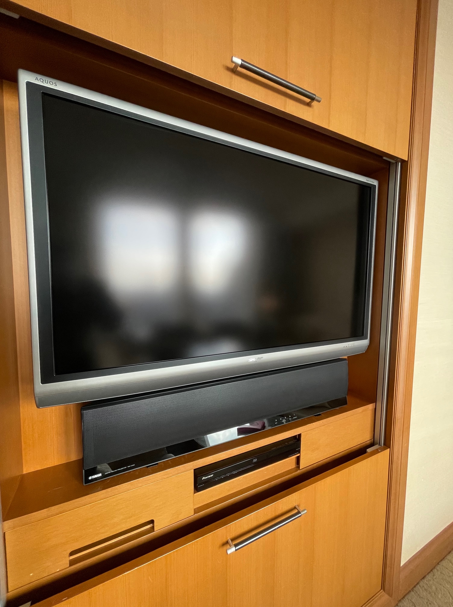 テレビはシャープ製で、パネルが上下にスライドする棚に収納されています。テレビを見ない場合は上の写真のように完全に隠すことができます。