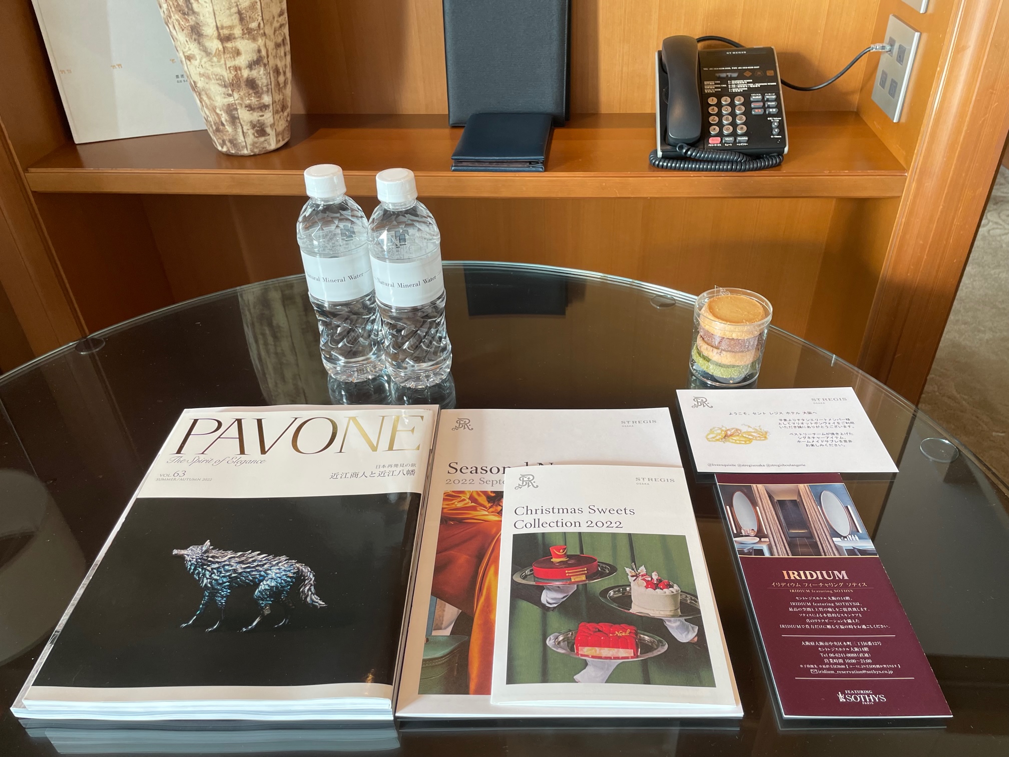 テーブルの上にはミネラルウォーターやウェルカムスイーツのサブレなど