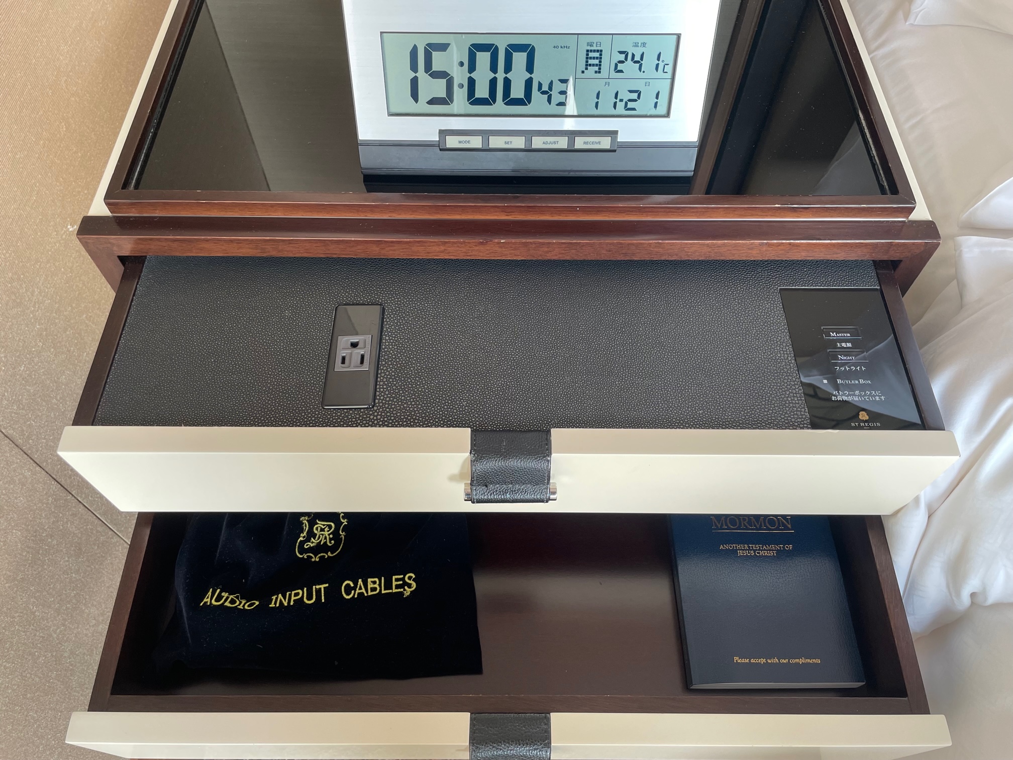 引き出しを開けるとコンセント1口と照明のスイッチ、オーディオケーブル