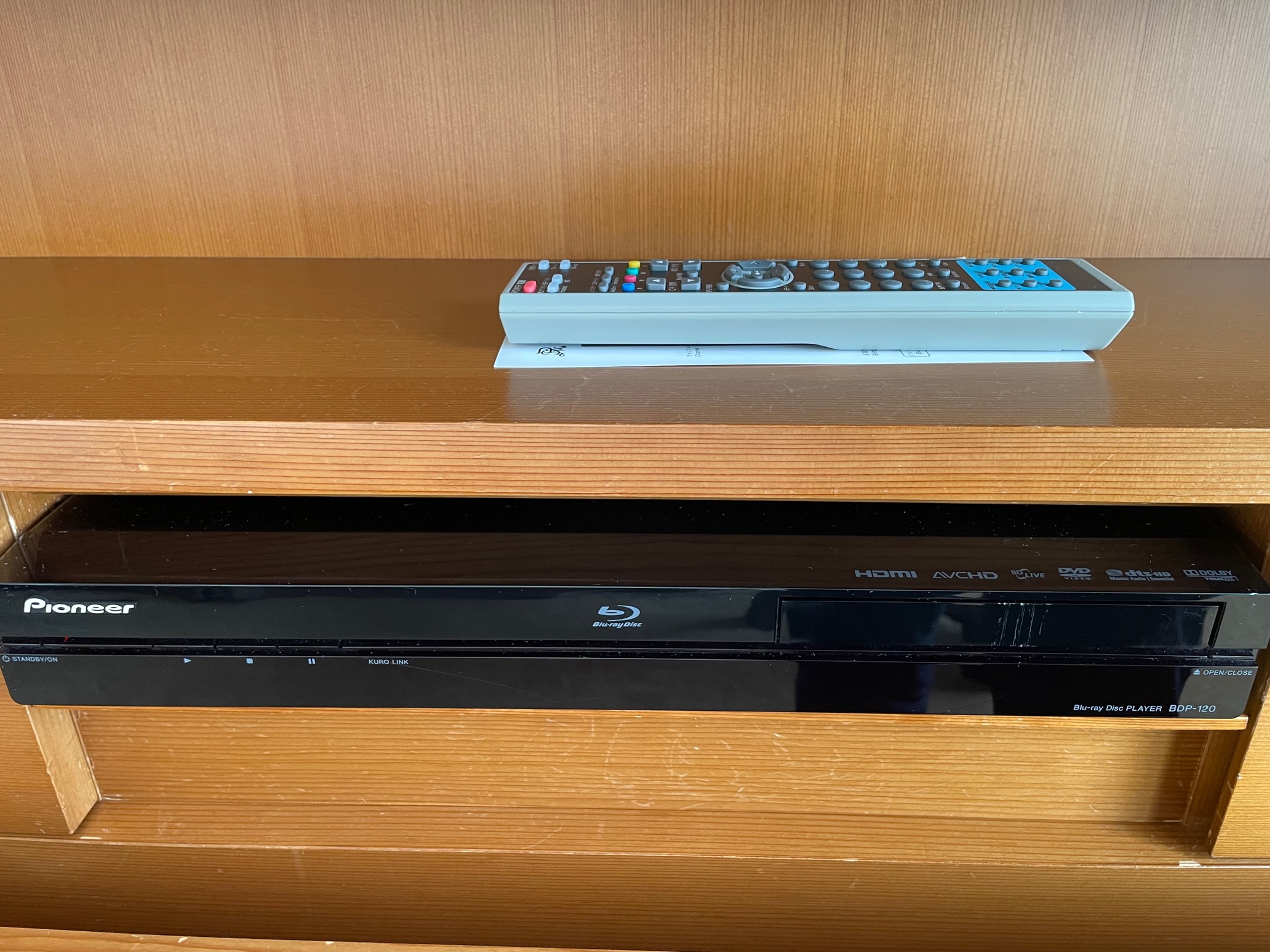 テレビの下にはYAMAHA製のスピーカー、パイオニア製のブルーレイプレーヤーもありました。AV入力端子やHDMI端子もあります。
