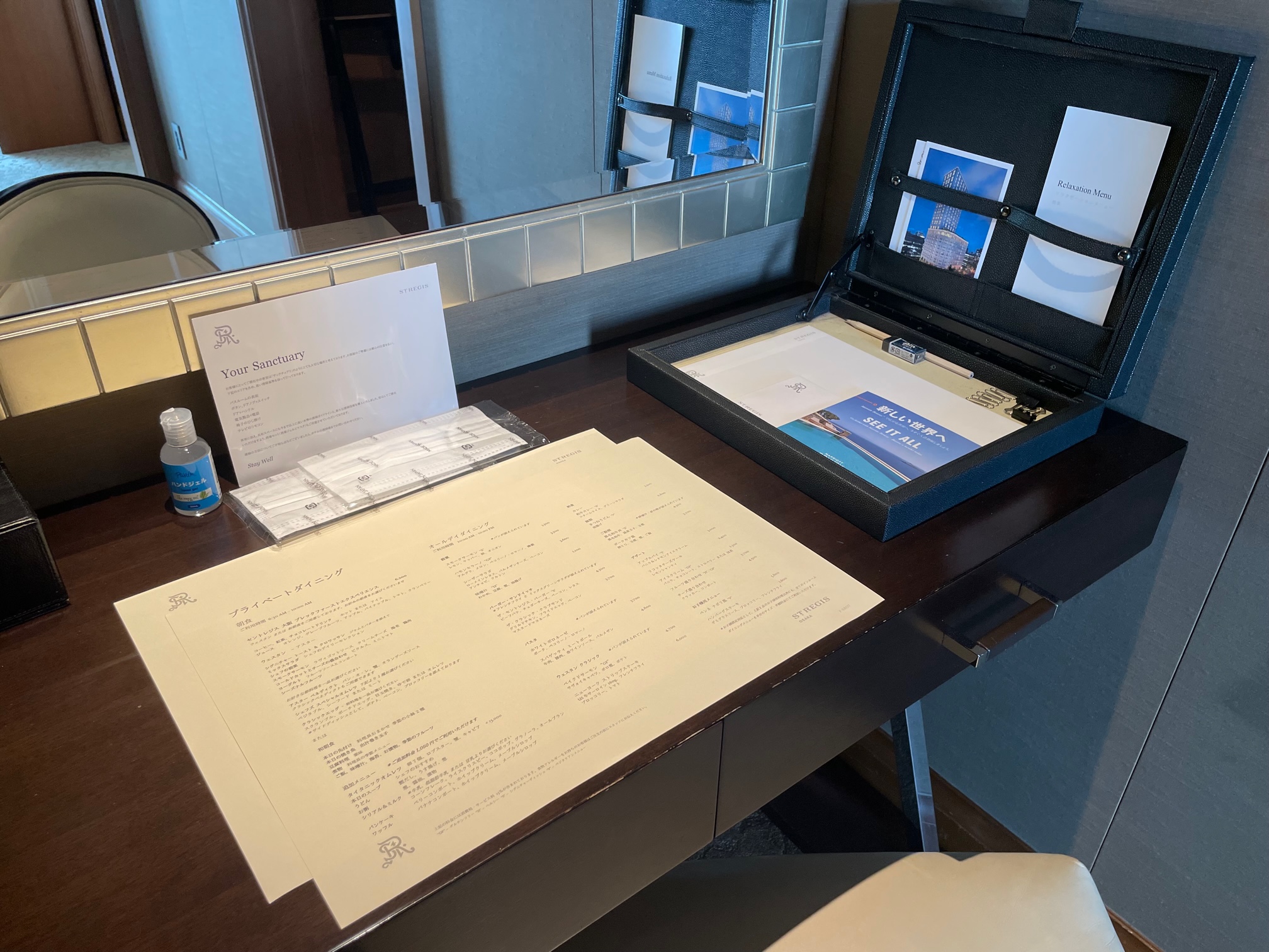 テーブルの上にはマスク、アルコールジェル、ルームサービスのメニュー