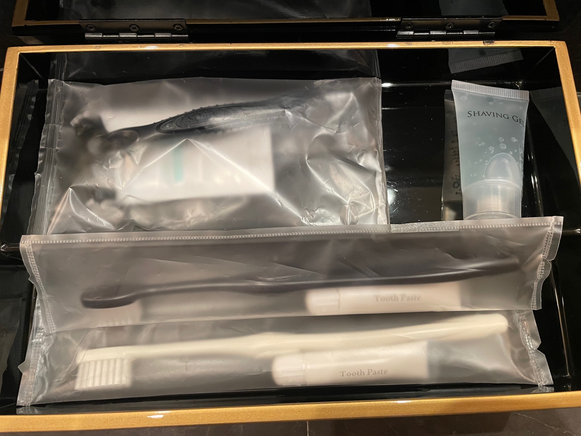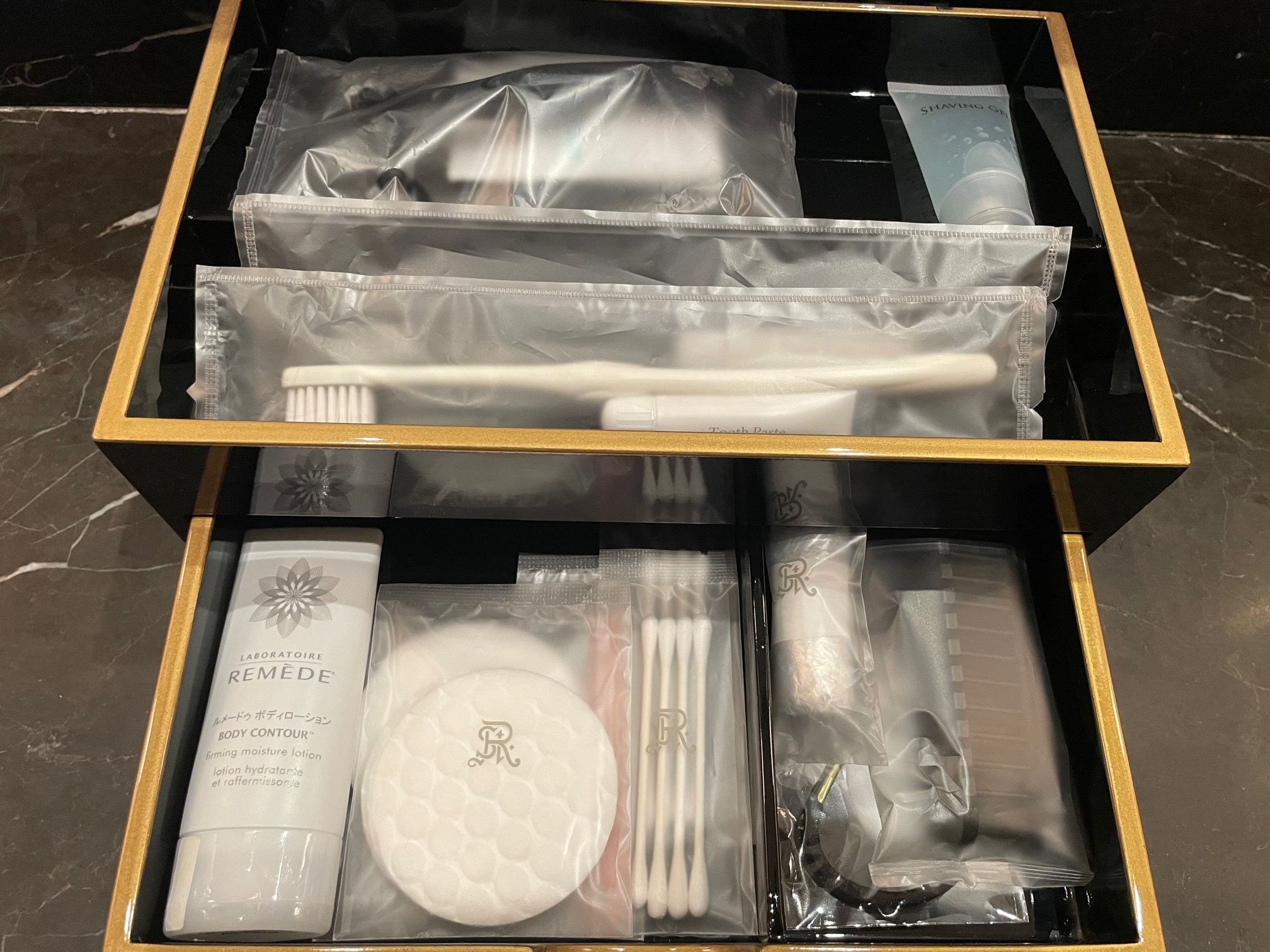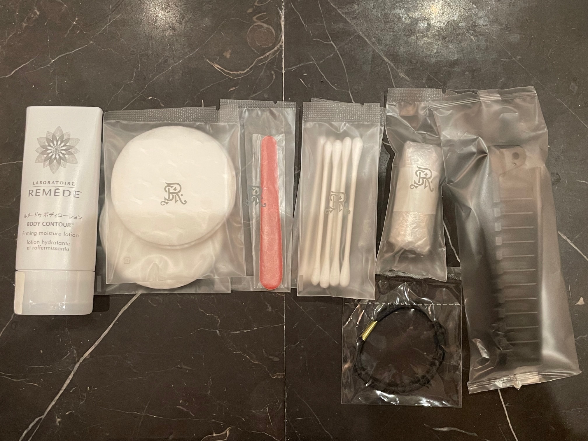 下段はルメードゥのボディーローション、コットンパフ、やすり、綿棒、シャワーキャップ、ヘアゴム、クシ