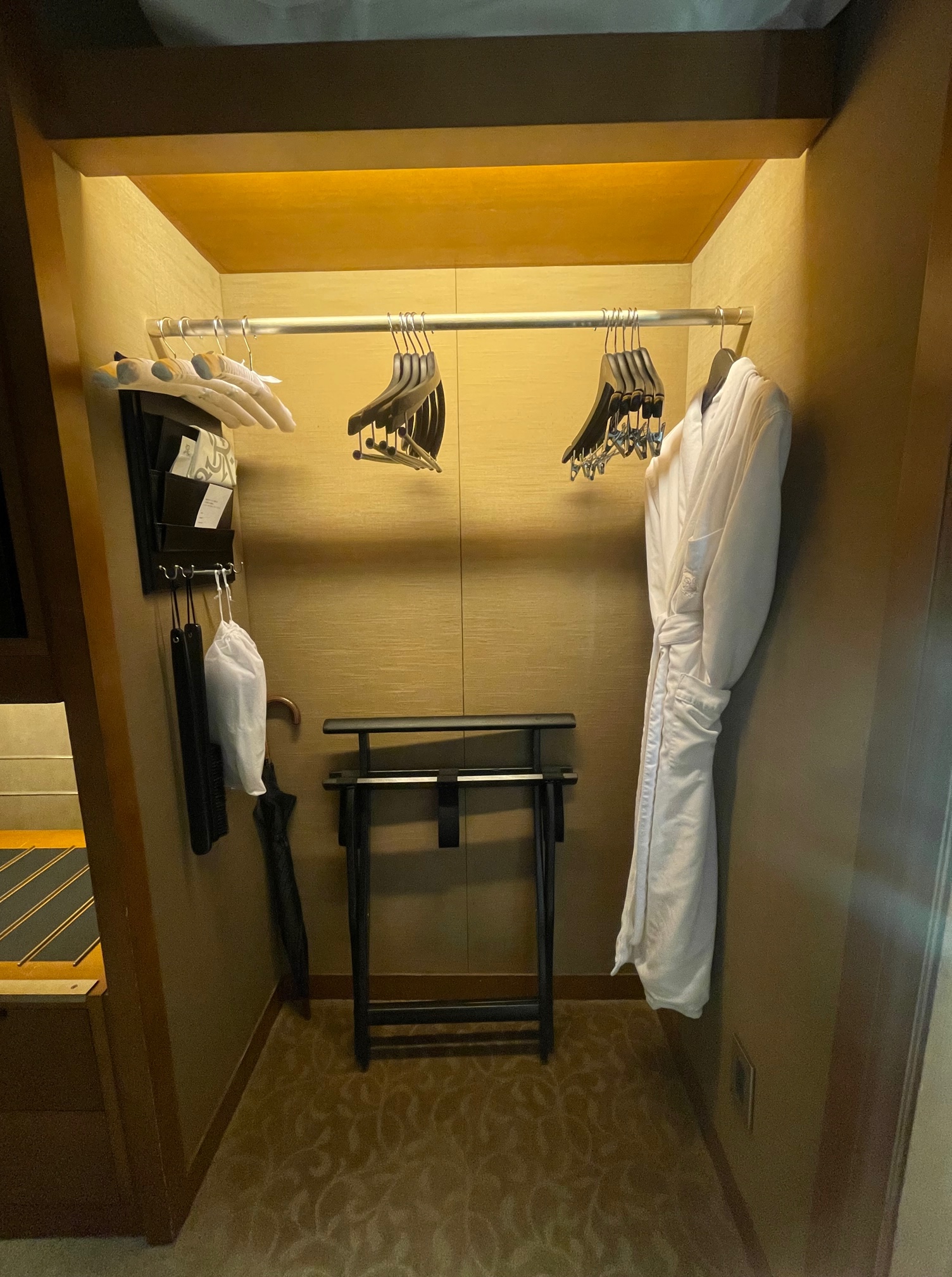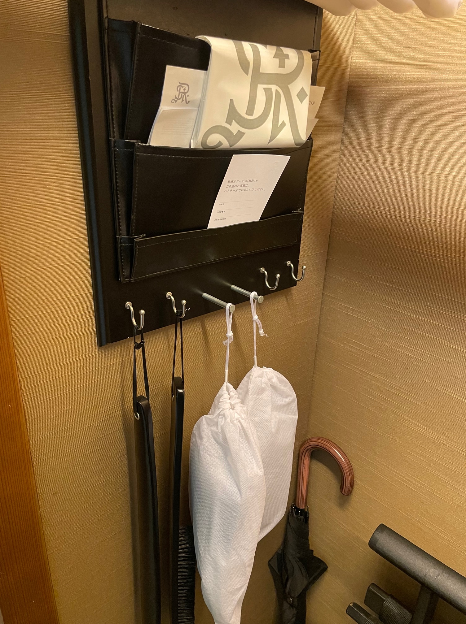 クローゼットにはスリッパ、靴ベラ、ブラシ、ランドリーバッグと伝票も掛けられています。