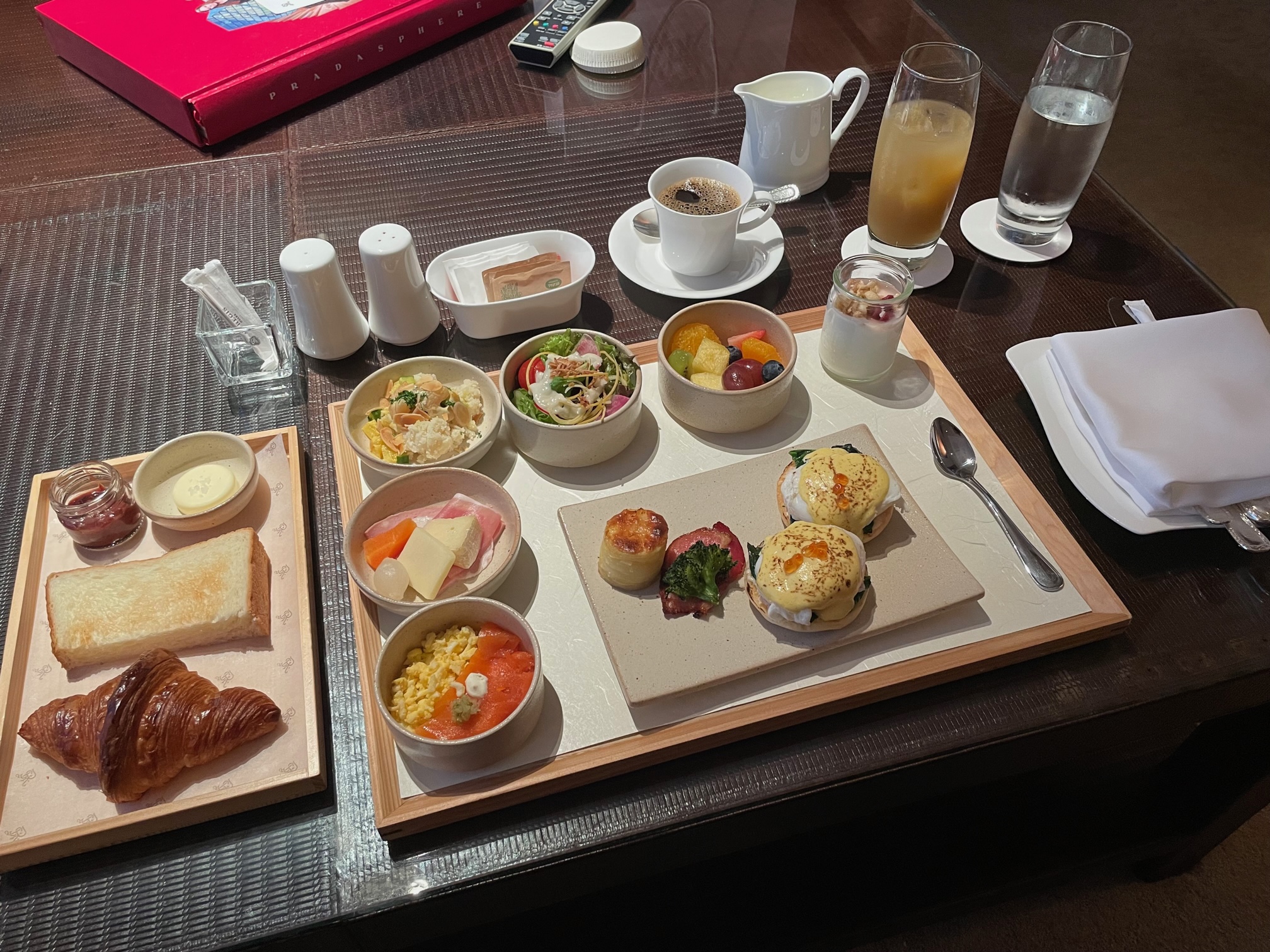 この日はレストランでの朝食が7時からでレストランでの朝食は提供されるのに時間がかかると聞いたので、1,550円の追加料金を支払って6時半から朝食を提供して下さるルームサービスに振り替えて頂きました。