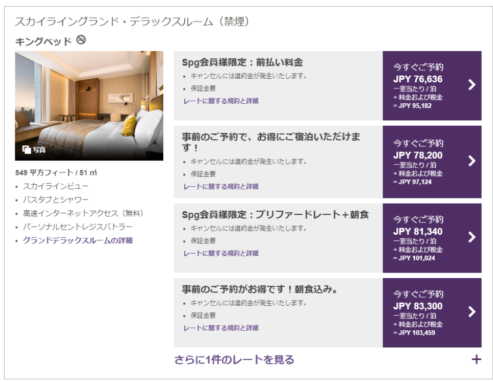 セントレジス大阪は統合後カテゴリー8となっていますが、カテゴリー8の運用は2019年2月からと言われており、2019年1月末までの予約であればカテゴリー7として扱われ少ないポイント数で利用可能となっています。つまり、2019年2月からは70000~100000ポイント/泊必要なのですが、2018年時点は60000ポイント/泊で宿泊できます。