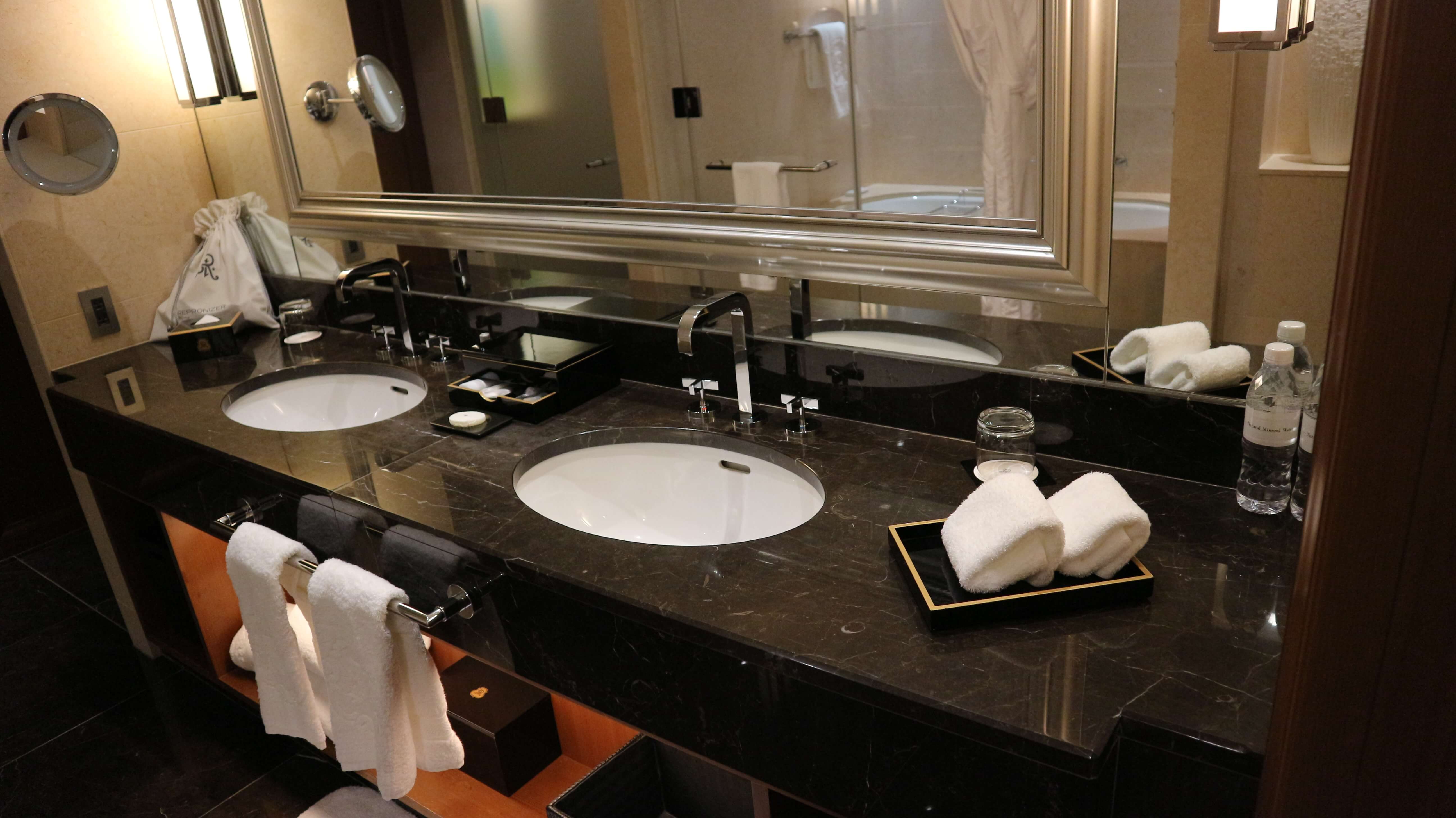 まず手前左に入るとダブルボウルの洗面所があります。高級感があり広々としてとても素敵な空間です。