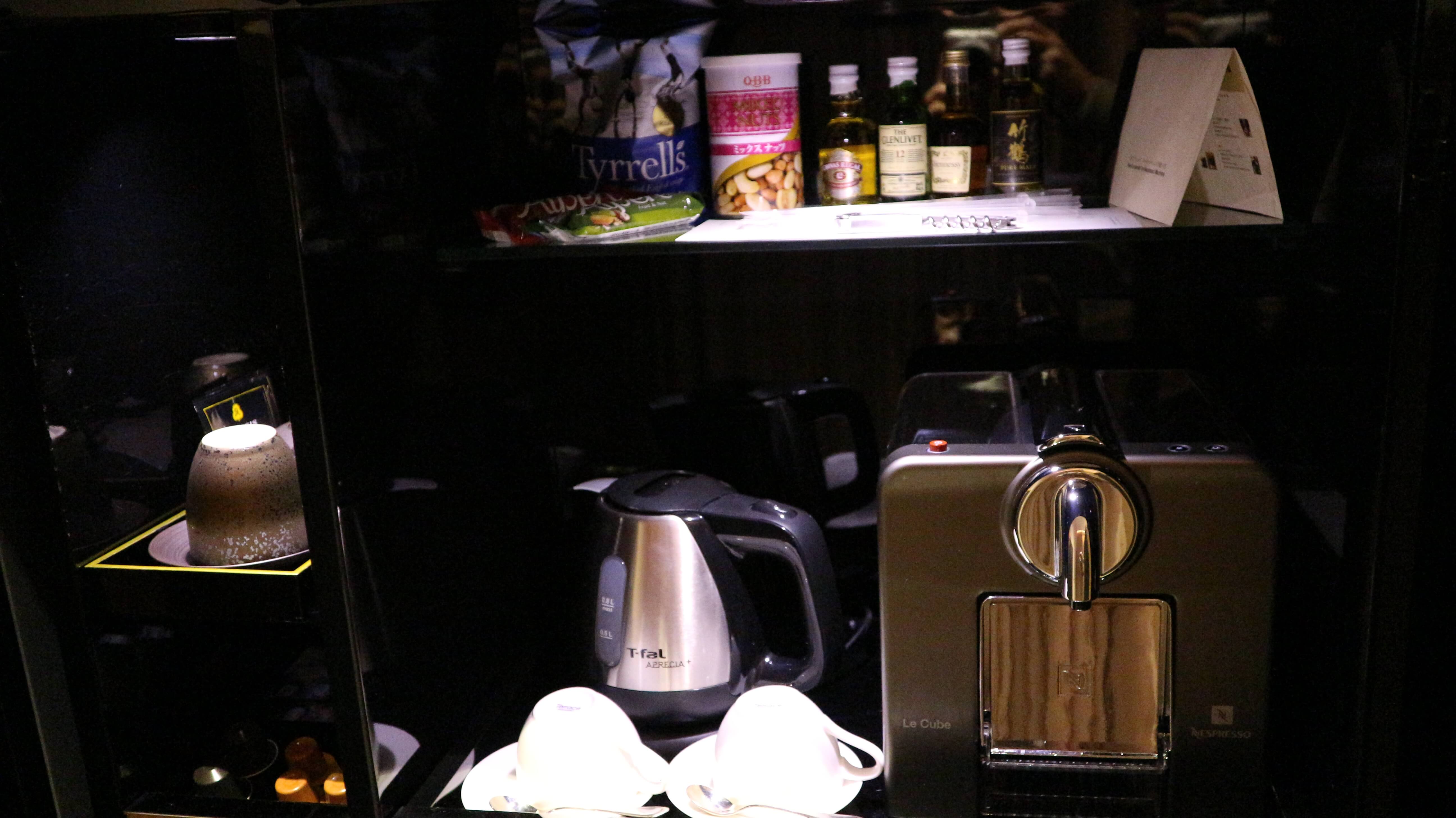 上段にはエスプレッソマシーンとお菓子類、ウイスキーなどがあります。