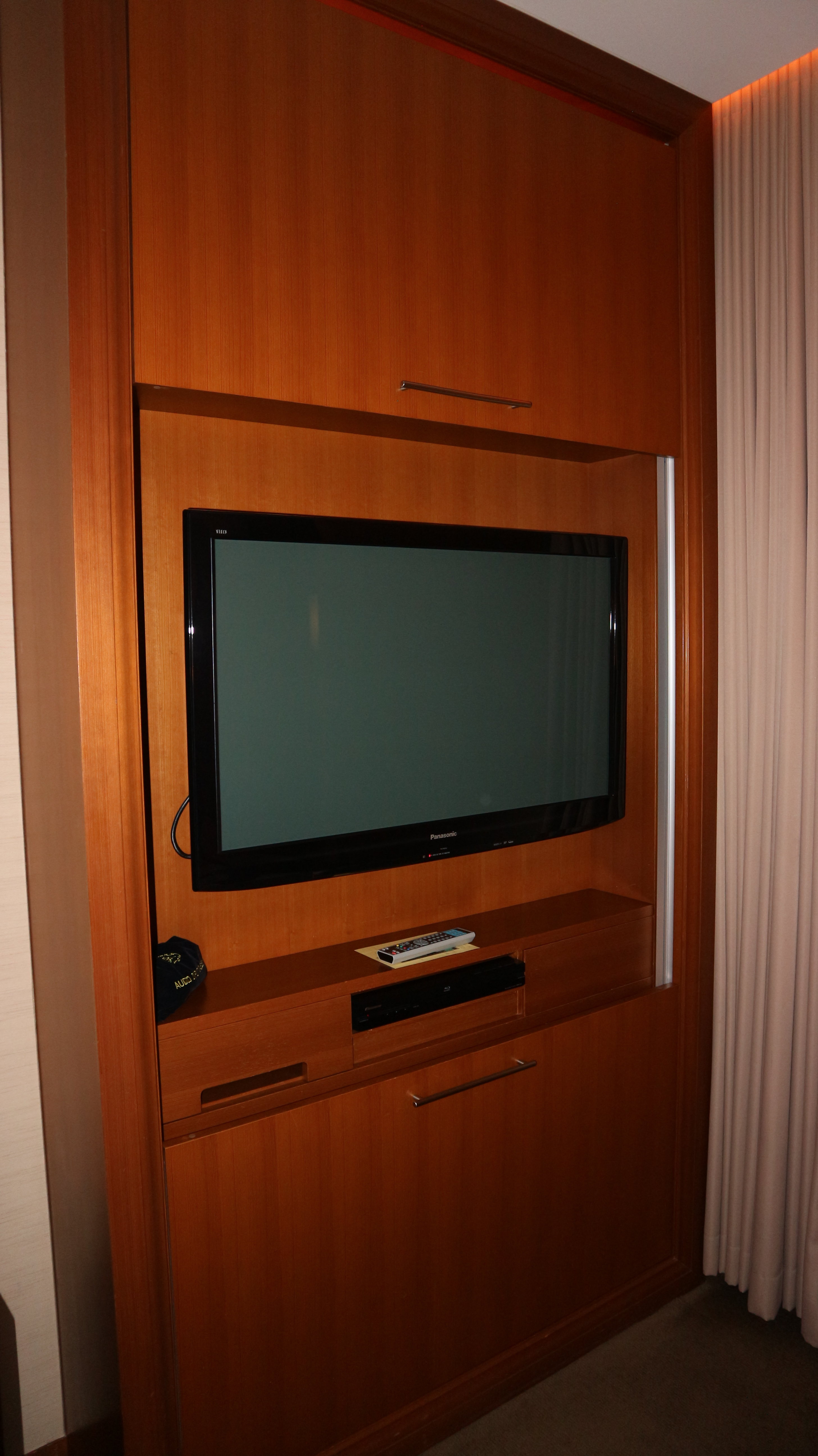 テレビはPanasonic製の42インチで、パネルが上下にスライドする棚に収納されています。テレビを見ない場合は上の写真のように完全に隠すことができます。テレビの下にはパイオニア製のブルーレイプレーヤーもありました。子供用にDVDを持参して部屋でゆっくり過ごすことができました。AV入力端子やHDMI端子まであり左下の黒い袋の中にはケーブルまで用意されています。