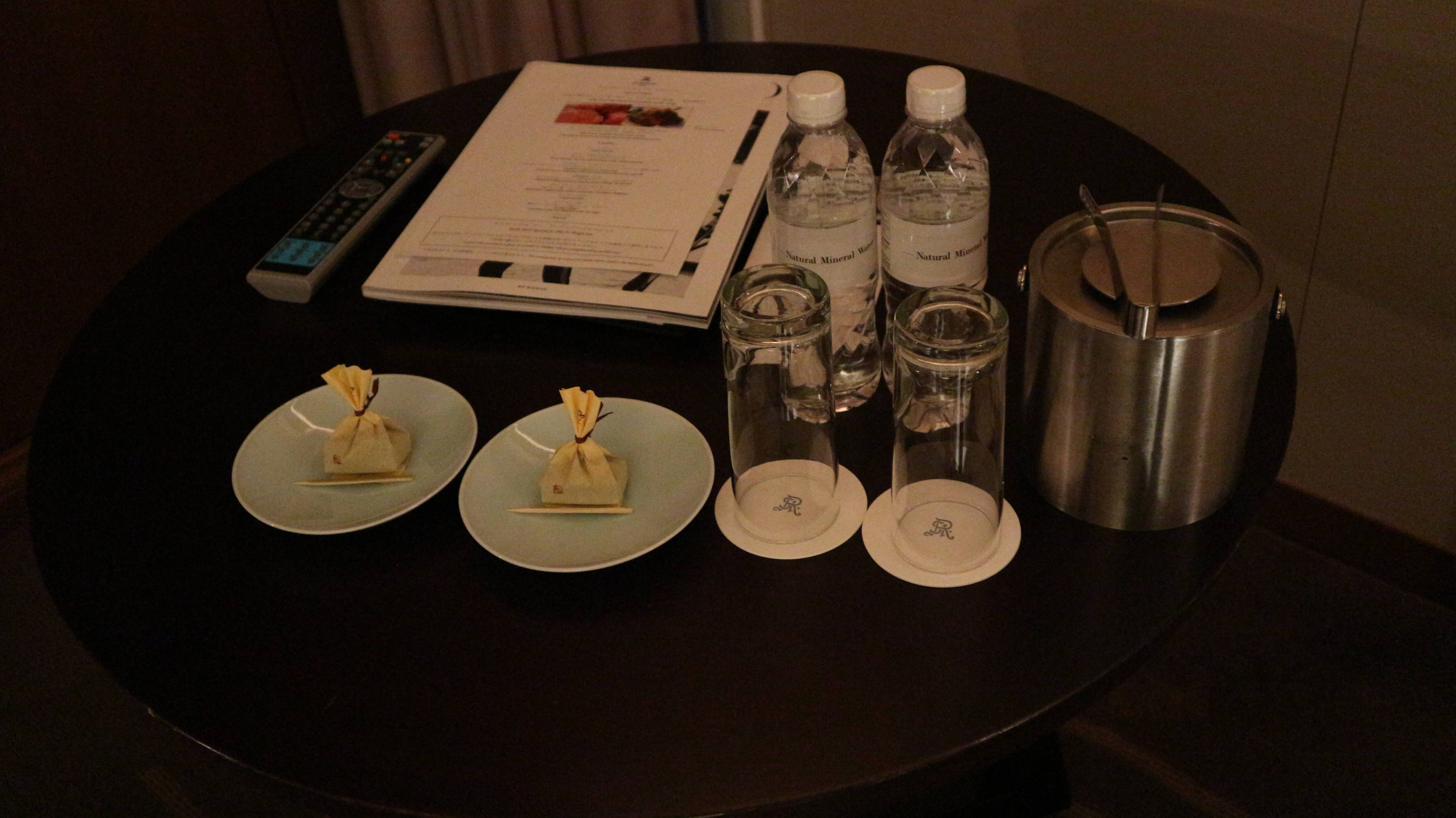 夕食を終え部屋に戻るとターンダウンサービスが完了しています。ベッドの上に浴衣が、足元にマットとスリッパがセットされ、アイスペールとミネラルウォーターがテーブルに用意されています。