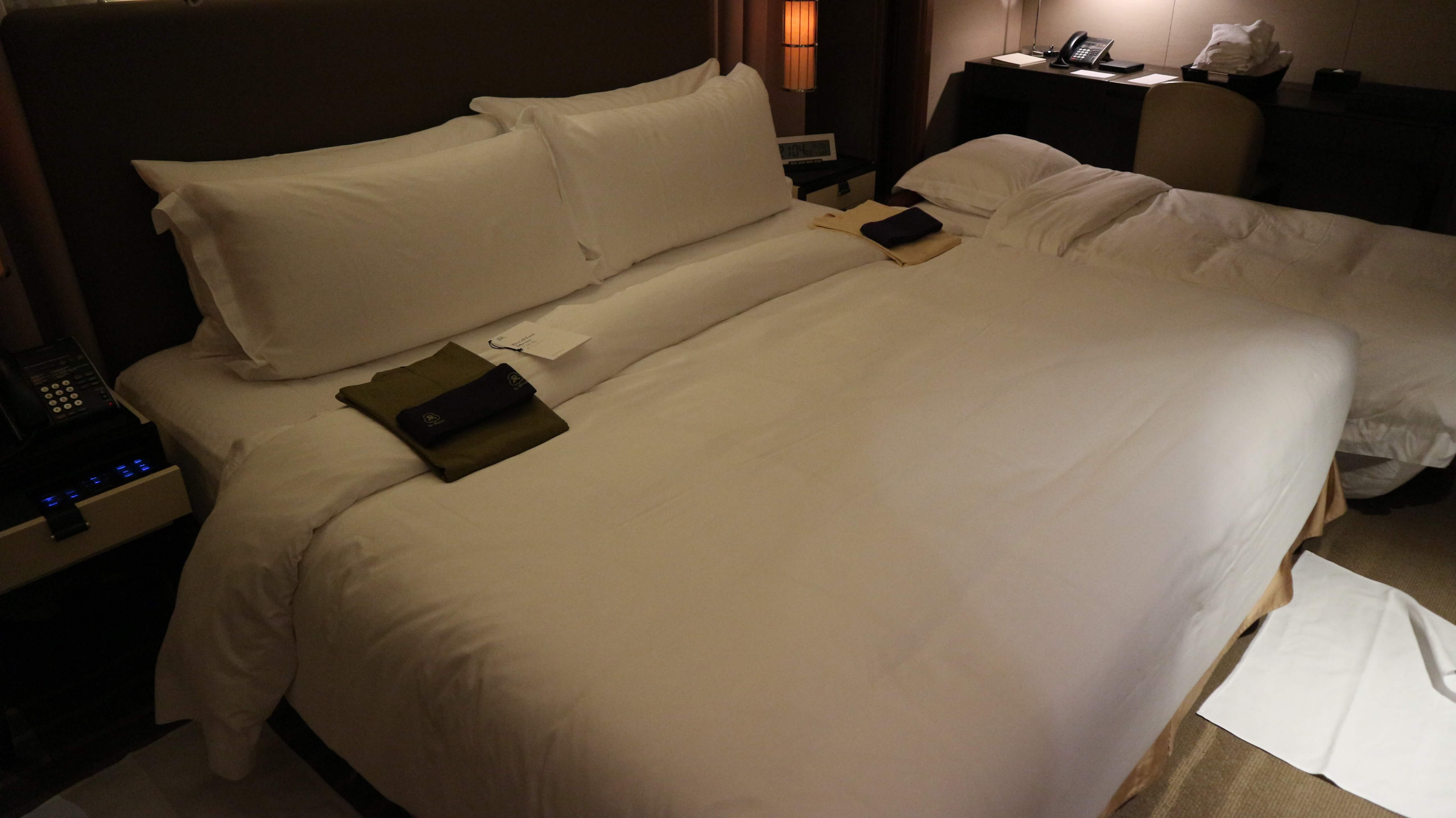 セントレジス大阪では12歳までは添い寝可能なのですが、今回は小学生の長女用にエキストラベッドを入れてもらいました。奥にあるのがエキストラベッドになります。