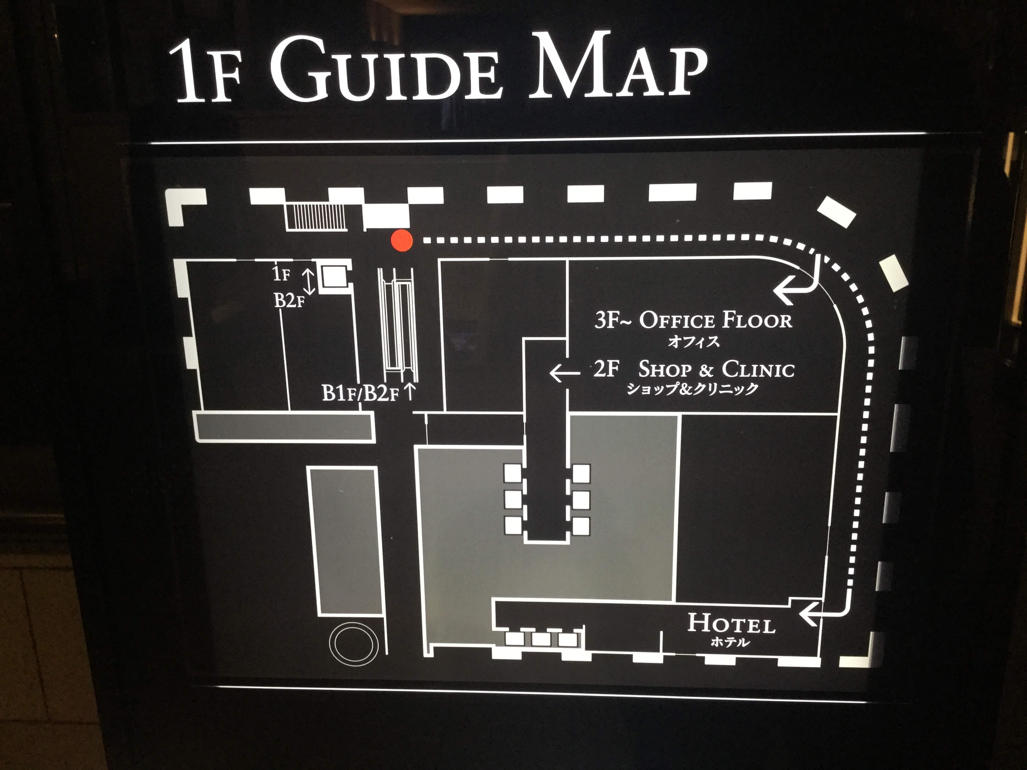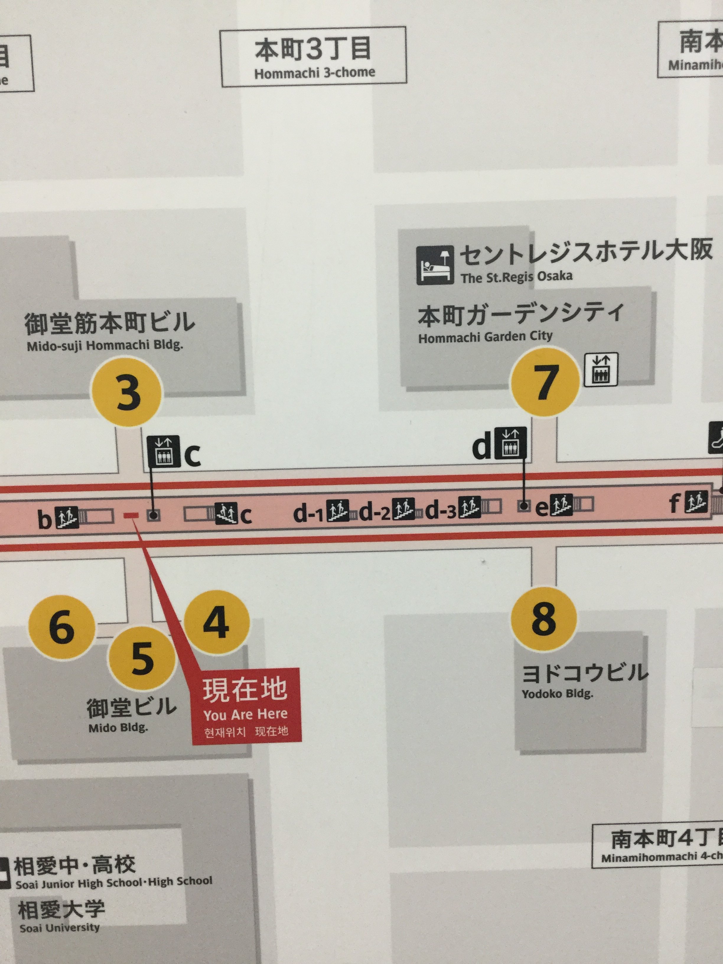 エスカレーターを上がり地上に到着するとこのような地図があり、ホテルエントランスは御堂筋と反対側にひっそりとあり、ぐるっと回る必要があることが分かります。