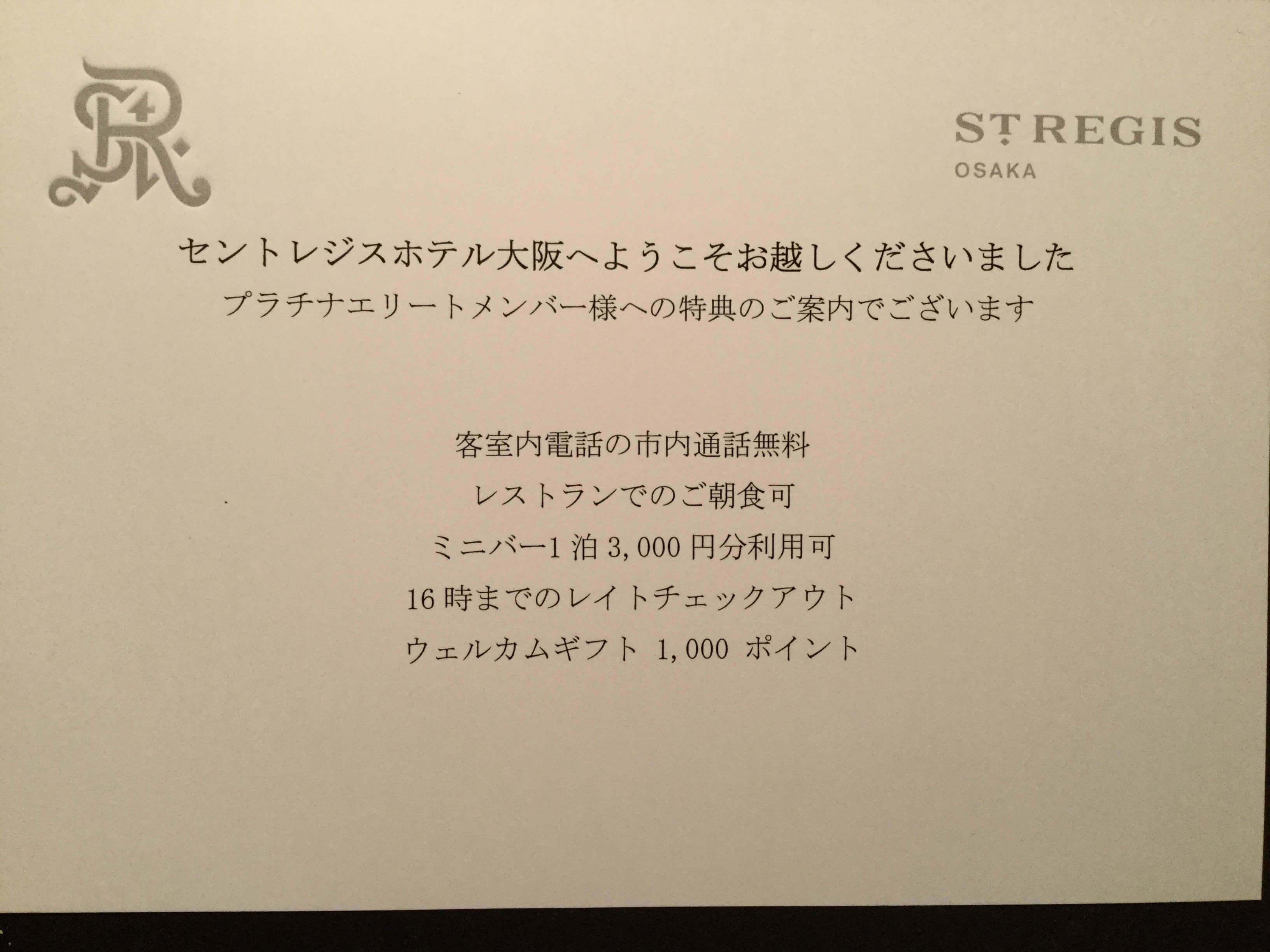 セントレジス大阪 プラチナエリート会員特典は以下の通りです
