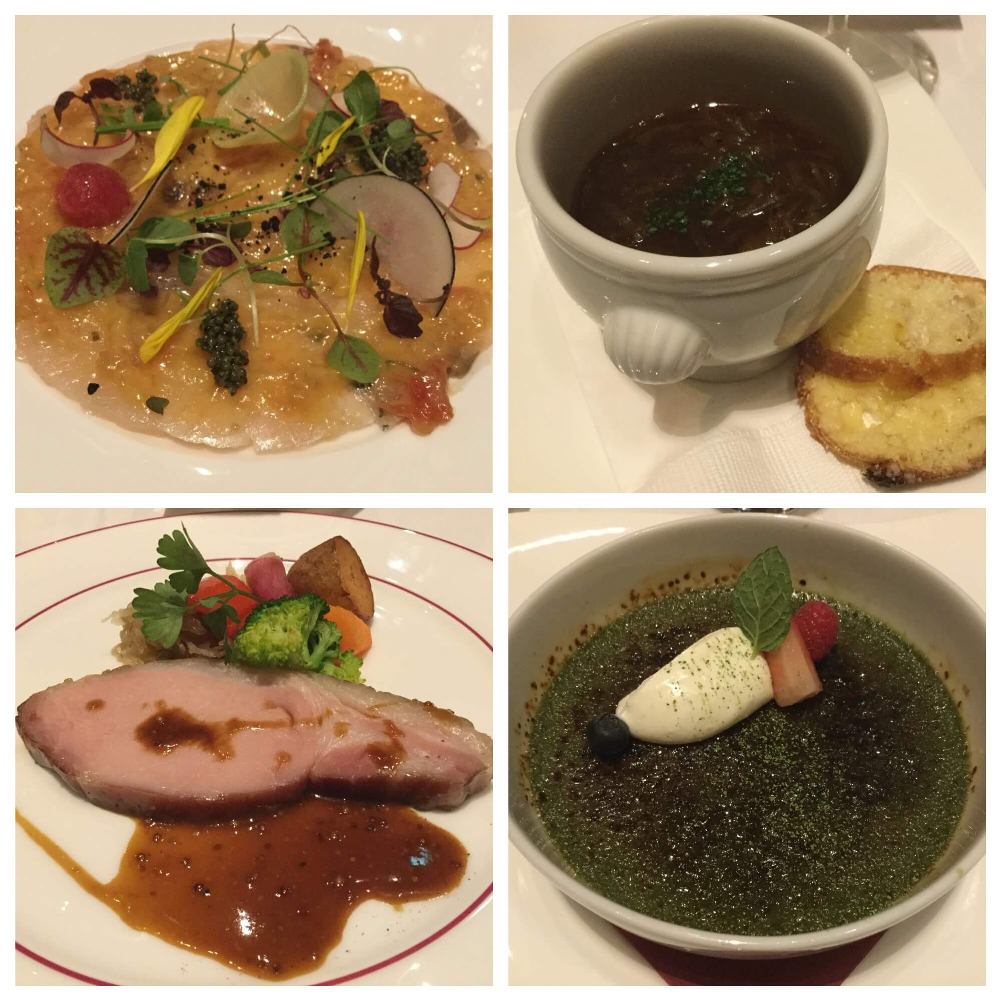 しまあじのマリネ、オニオングラタンスープ、豚ロース肉の低温調理、抹茶のクリームブリュレの4品を頂きました。豚ロース以外は追加料金がかかりますので+1500円ほどですがそれでも6500円と大満足でした。