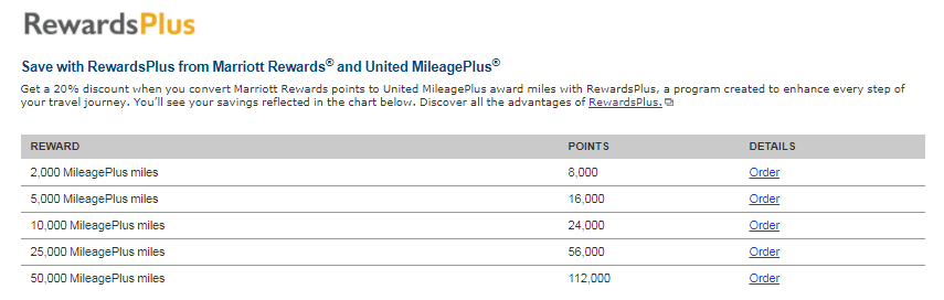 すると以下のようなユナイテッドマイレージプラスへの交換のページが出てきます。希望のポイント数の横の「Order」をクリックしましょう!先ほども申しあげたように最大に効率よく交換できるのは「56000リワードポイント(→25000マイル)」「112000リワードポイント(→50000マイル)」の2パターンです。