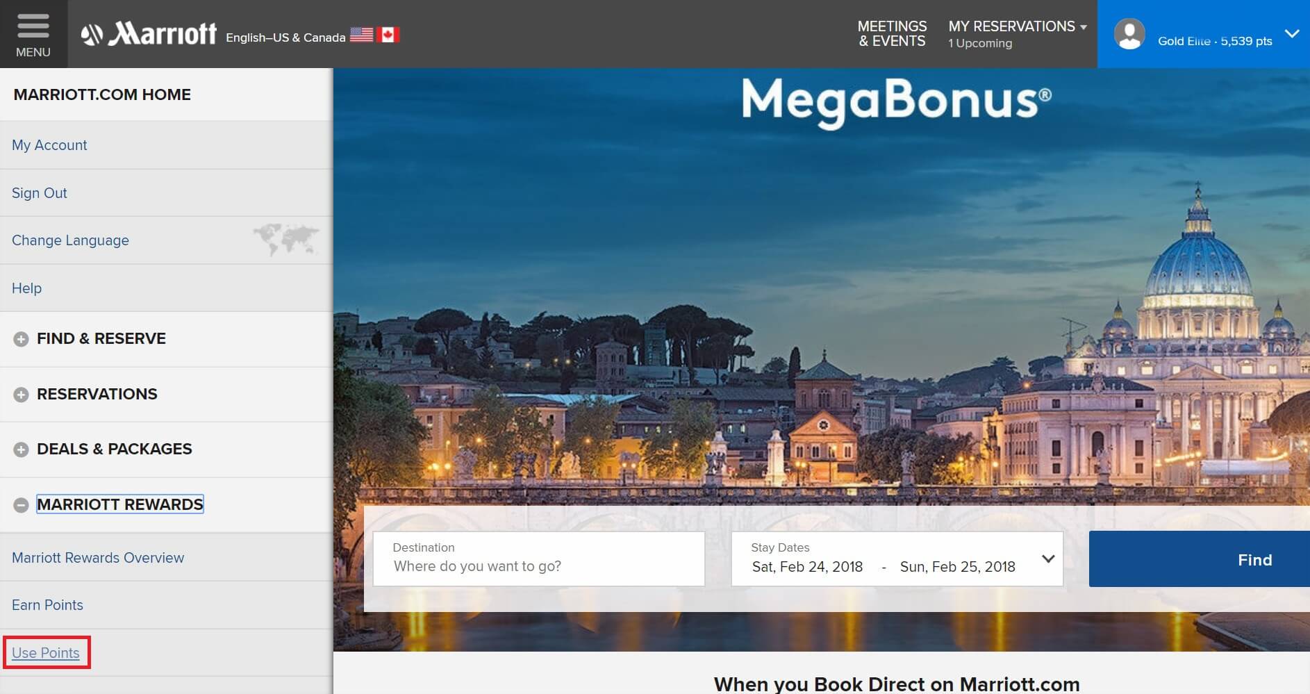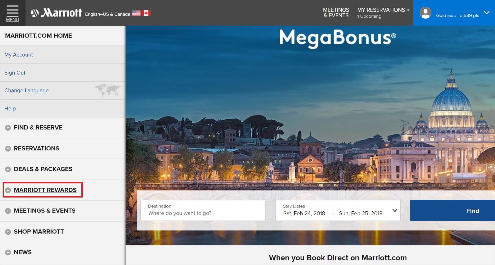 次にメニューが展開されますので下の画像の赤四角「MARRIOTT REWARDS」をクリックしましょう