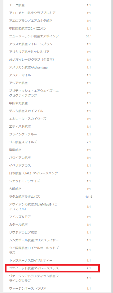 ほとんどの航空会社が1:1の比率で交換できるのですが、ユナイテッド航空の交換比率は2:1と他に比べて悪いのです…