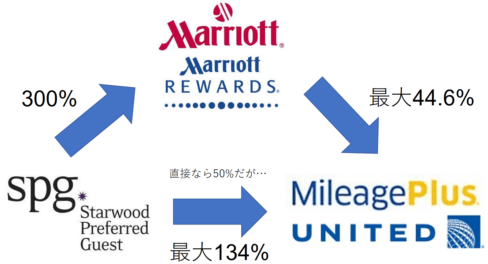 SPGスターポイントをユナイテッド航空マイレージプラスに直接移行すると半減してしまうのですが、一旦マリオットリワードポイントに交換してからマイレージプラスに交換することで最大1.34倍で交換できます。