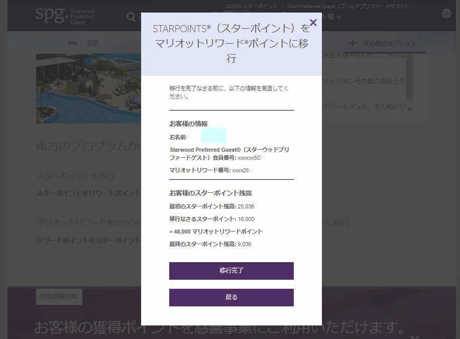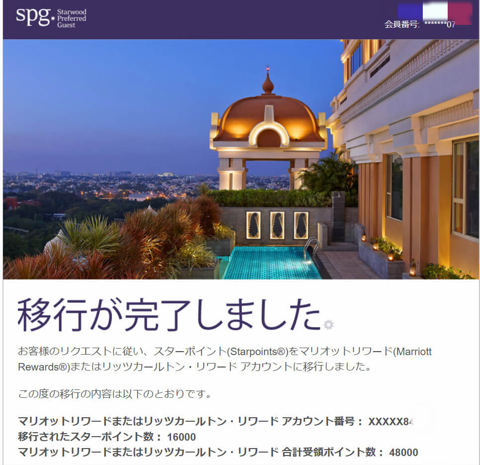 1:3の交換比率なのでマリオットリワードポイントは48000ポイントになります。下のような確認画面が出ますので問題なければ「移行完了」ボタンを押しましょう!