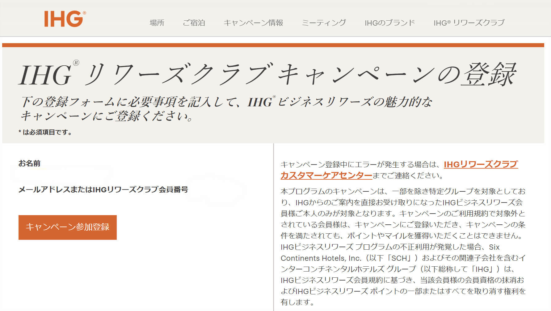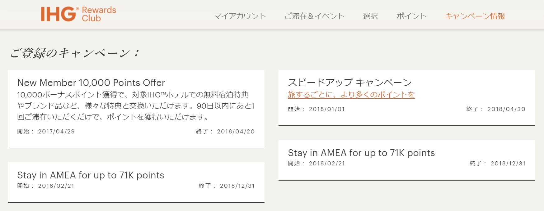 そしてIHGホームページのマイページでも登録されたキャンペーンが確認できます。今回はちゃんと登録されているようです。僕の場合はなぜか同じキャンペーンが2つ並んでいますが…