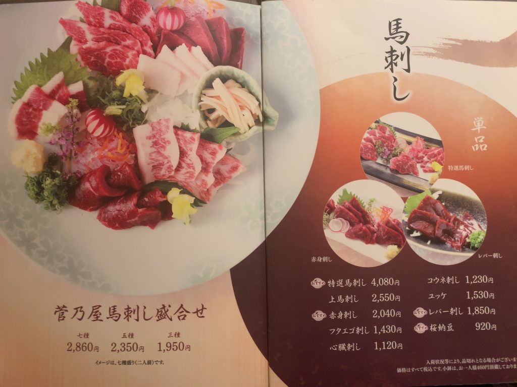 熊本で有名な馬肉料理店「菅乃屋」銀座通り店のメニューや実際に頂いたものをご紹介しました。