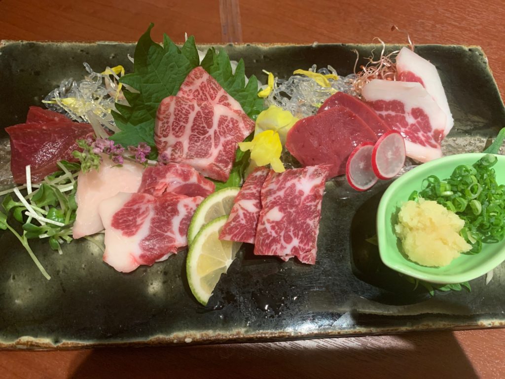 めちゃくちゃきれいな馬刺しです。大阪で馬刺しを食べると赤身しか出てこないことが多いので霜降りがインパクトが強かったです。パッと見た感じ脂が多くて重いのかなと思いましたが脂はスーッと口の中で溶けて思ったよりあっさりです。そして最後に甘味が残ります。生姜で甘さが引き立つような印象です。またタテガミ、コウネ、フタエゴ、心臓など大阪では食べたことがない部位も美味しく頂きました。
