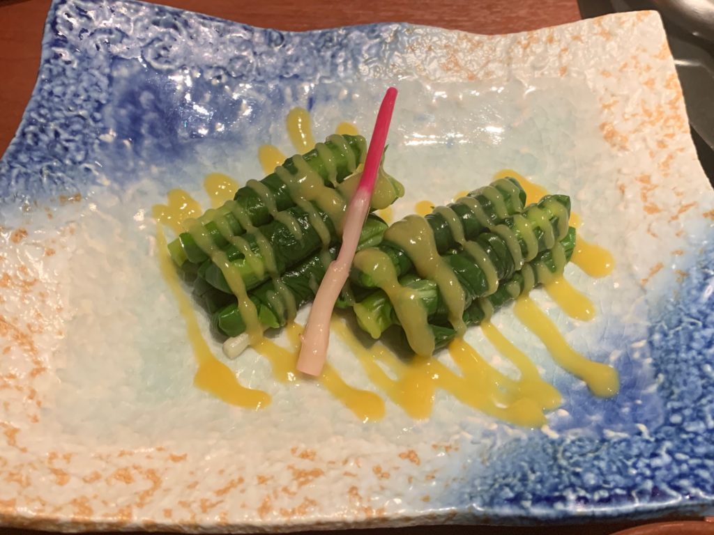 メニューを見て全くピンときませんでした(笑)お店の方に伺うと熊本の郷土料理だそうです。ひともじ(ネギ?わけぎ?)をさっと茹でて冷まし、白根を軸にぐるぐると巻きつけたものを酢味噌でいただくものです。