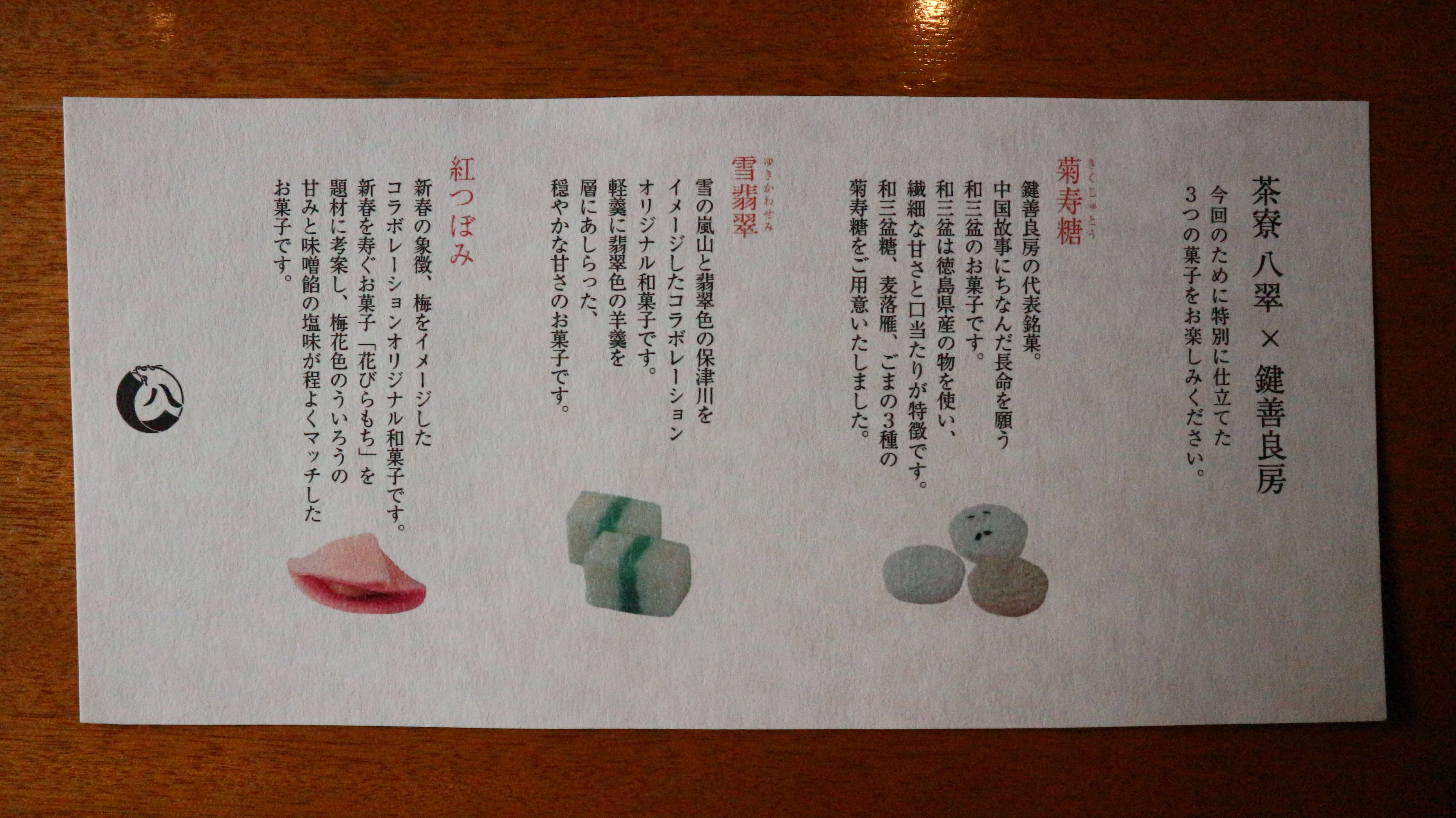 この時期は江戸中期創業の老舗「鍵善良房」とコラボレーションした「茶寮八翠」オリジナルのお菓子が目玉となっています。