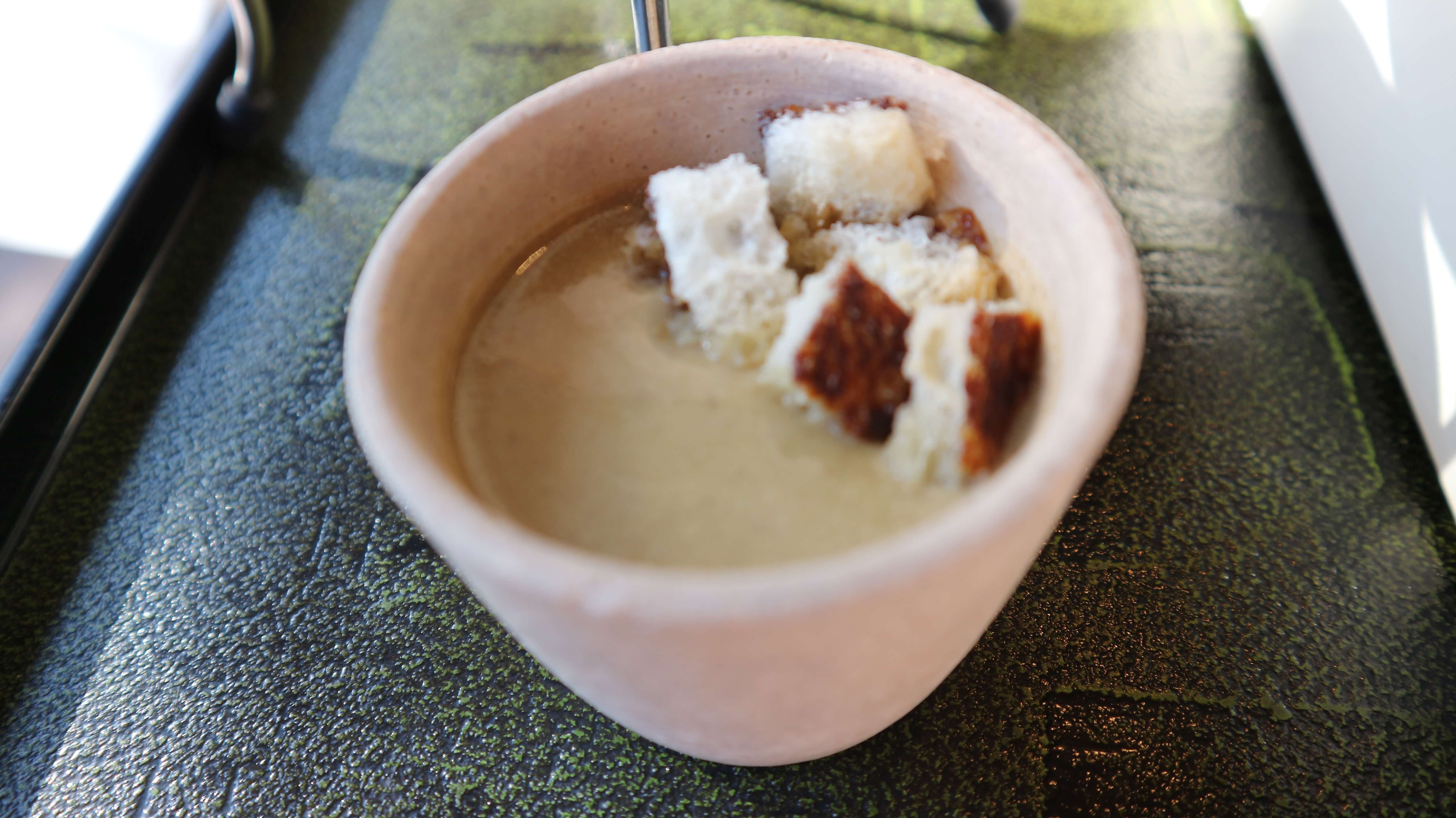 この野菜スープがとても美味しかったです!クルトンに焦げ目がついているのは白味噌を塗った部分を炙ったもので味噌の香ばしさが感じられて面白い感覚でした。